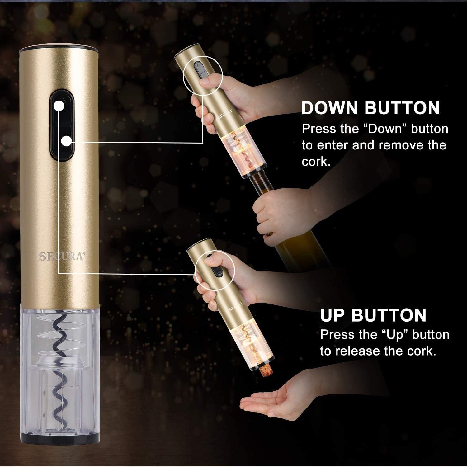 Secura Electric Wine Opener, Automatic Bottle Corkscrew Opener with Foil Cutter, Rechargeable (Champagne Gold)