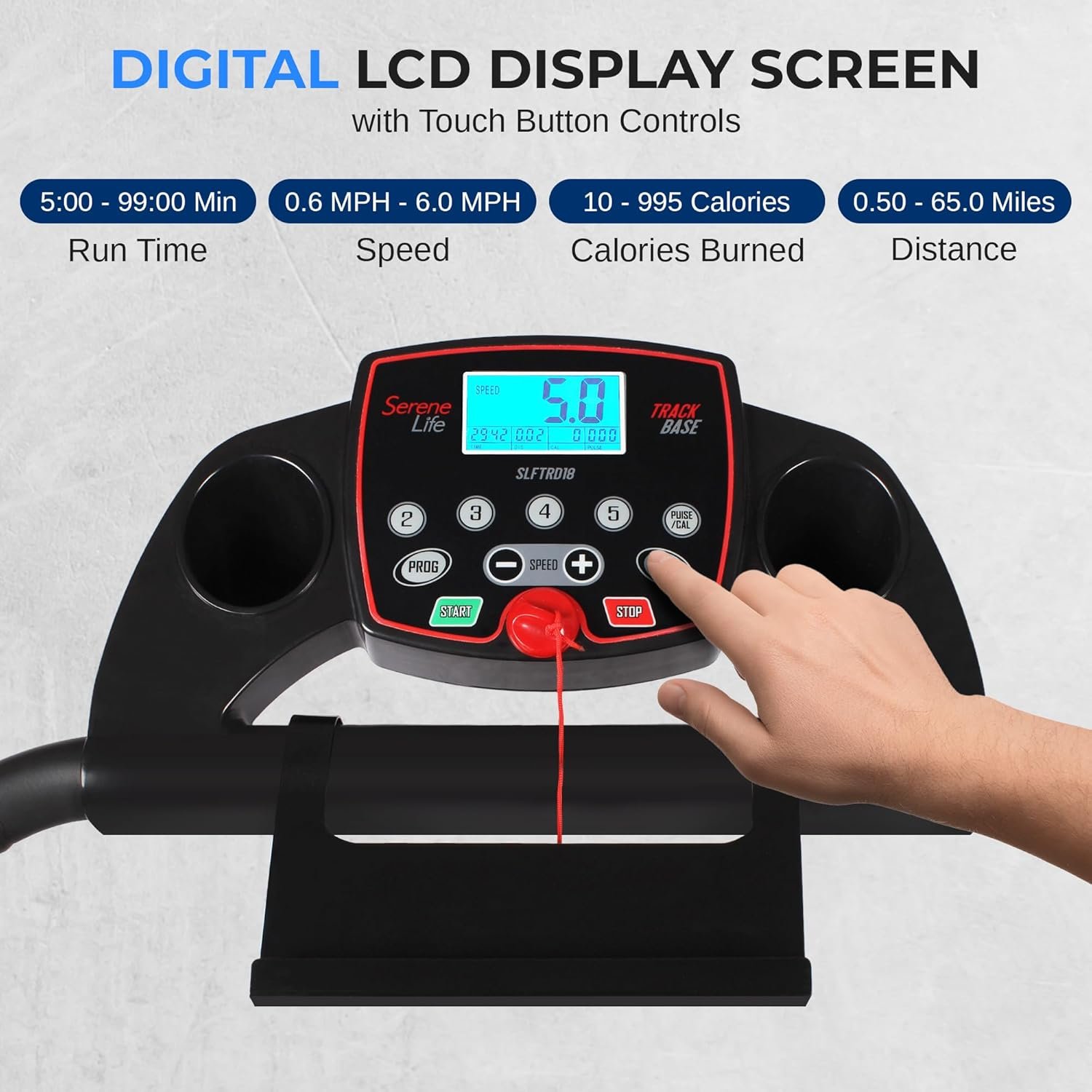SereneLife Model : SLFTRD18Digital Smart TreadmillTrack Base Smart Digital Treadmill with Downloadable App Features: Smart Digital Treadmill DesignGet Connected with the ‘FitShow’ AppPairs to Your Device via Bluetooth ConnectivityRunning & Training Data Statistics ReadoutCompact Form-Fitting Design for Any Room in the HouseBuilt-in Hand Grip Sensors for Pulse MonitoringDigital LCD Display Screen with Touch Button ControlsDisplays Run Time, Distance, Speed, Calories Burned, Heart RateAdjustable Speed SettingsSelectable Preset Training ModesSimple Electric Motorized Plug-in DesignConvenient Folding Style for Easy Setup & StorageUsed for Walking, Jogging, Running Exercise TrainingPerfect for Weight Loss, Cardiovascular Fitness, Endurance & Stamina BuildingIntegrated Safety Key, Emergency Power OffRemovable Book / Tablet Device Holder*Some Assembly RequiredThe ‘Fitshow’ App: Train Smarter and Connect via Your Favorite DeviceWorks with Smartphones, Tablets, Laptops, etc. Free to Download via Your SmartphoneMultifunctional Sports AppConnect to the Treadmill via BluetoothApp Provides Access to Exercise ActivitiesLinked to ‘HealthKit’ to Record and Collect Activity DataEasily Share Health and Fitness Data via Social MediaAvailable for iOS and AndroidBluetooth Connectivity: Hassle-Free Pairing, No Password RequiredCompatible with All of Today’s Latest Bluetooth Devices (Smartphones, Tablets, Laptops, Computers, etc. )Bluetooth Version: 4. 0 BLETechnical Specs: Motorized Treadmill Motor Power: 1. 0HPRunning Belt / Running Surface Size (L x w): 39. 3’’ x 13. 4’’ -inchesAdjustable Speed: 0. 6 – 6. 0 MPH (Up to 10 KMH)Maximum Weight Support: Up to 265 lbs. Power Supply: 120VThe SereneLife Track Base Smart Digital Treadmill with Downloadable App – Smart Digital Treadmill Design – Get Connected with the ‘FitShow’ App – Pairs to Your Device via Bluetooth Connectivity – Running & Training Data Statistics Readout – Compact Form-Fitting Design for Any Room in the House – Built-in Hand Grip Sensors for Pulse Monitoring – Digital LCD Display Screen with Touch Button Controls – Displays Run Time, Distance, Speed, Calories Burned, Heart Rate – Adjustable Speed Settings – Selectable Preset Training Modes – Simple Electric Motorized Plug-in Design – Convenient Folding Style for Easy Setup & Storage – Used for Walking, Jogging, Running Exercise Training – Perfect for Weight Loss, Cardiovascular Fitness, Endurance & Stamina Building – Integrated Safety Key, Emergency Power Off.