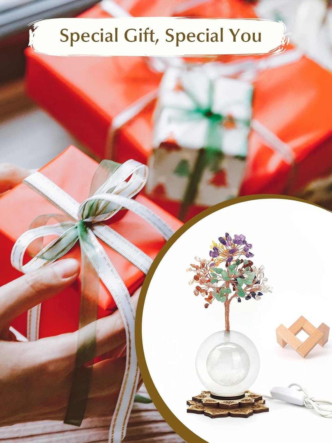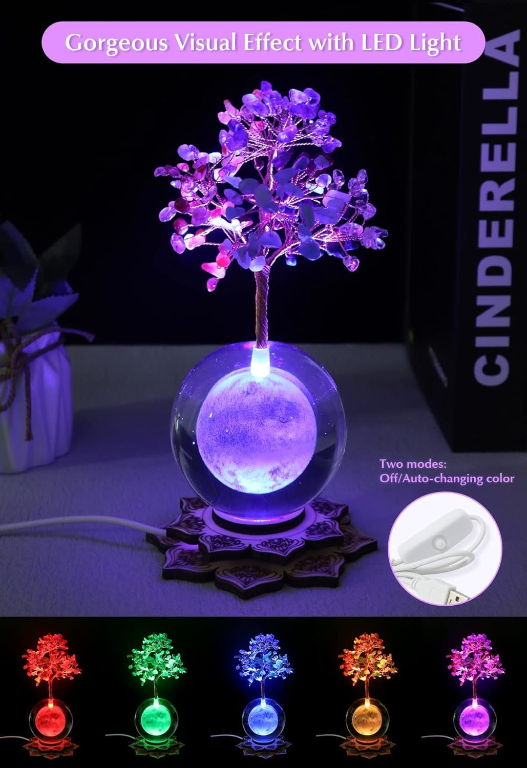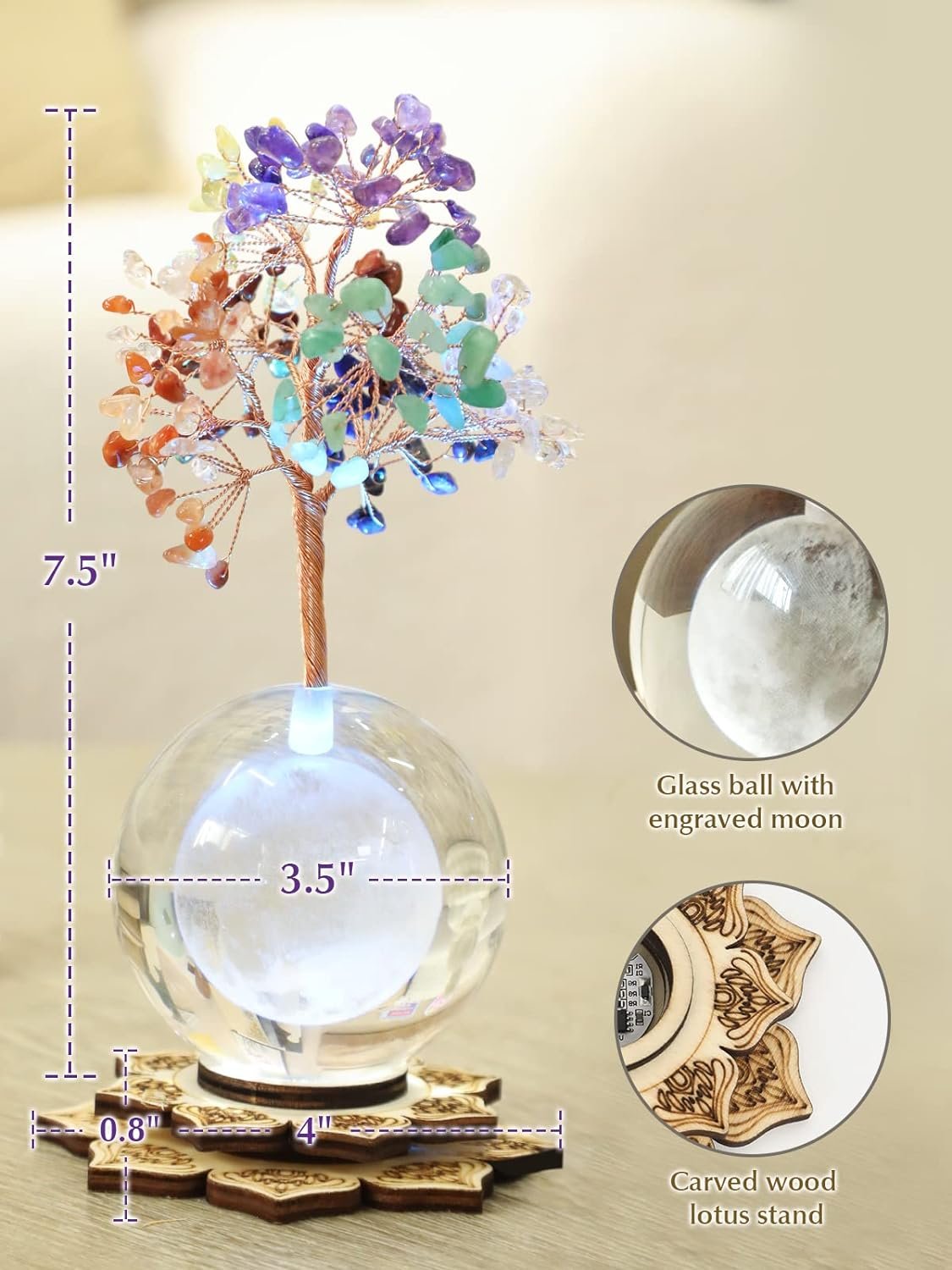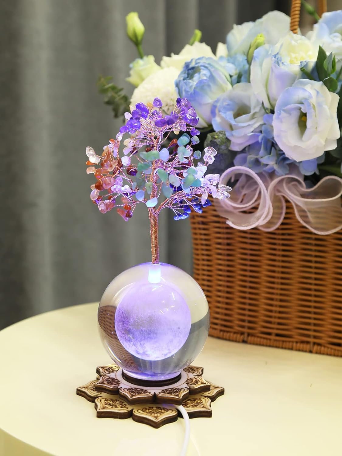 CHAKRA CRYSTAL TREE FOR POSITIVE ENERGY: Made with natural gemstones, crystal clear glass ball and lighted zen base, this cool healing crystal tree cleanses negative vibes and bring amazing beauty into any home or office. A crystal bonsai tree growing from the Earth, expresses the idea of harmony among mankind and nature. Hand-wrapped copper wire can be shaped in any styles you like.
