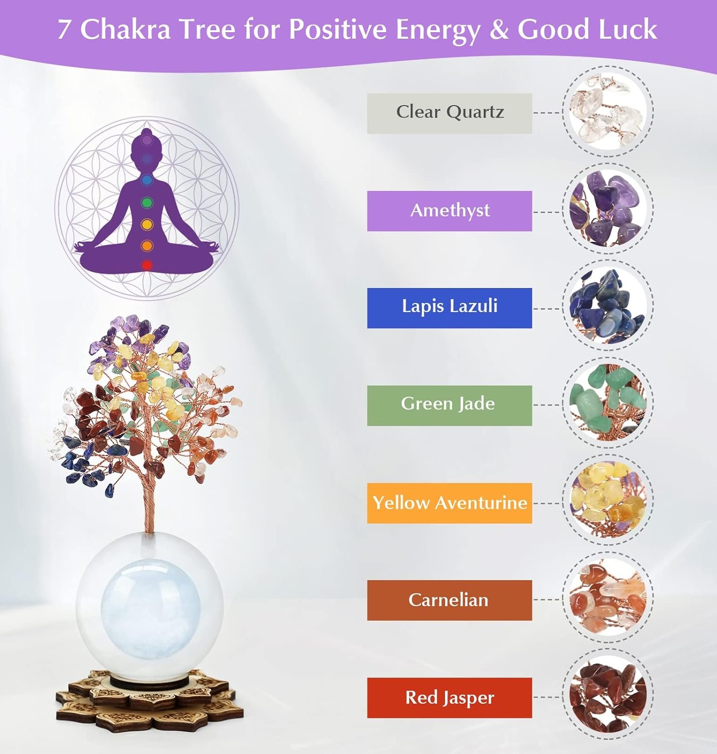 USE INSTRUCTION: These energy crystals are 100% natural, so some of them may have natural cracks or pits, and may vary from color, shape, sizes and pictures. Please buy carefully if you are concerned about these little natural imperfections. If for any reasons, you are unhappy with the 7 Chakra Crystal Tree Set, please don’t hesitate to let us know for a refund or replacement.