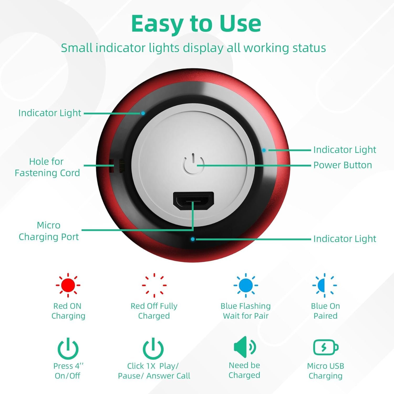 Simple to Use, Built-in Mic: Charge it before use. Long press power button to turn it on & off. Flashing blue indicator lights mean it waits for Bluetooth connection. While it turns as solid, it connected with Bluetooth device successfully. Short press power button to play/ pause/ answer phone call. Adjust volume of speaker by device