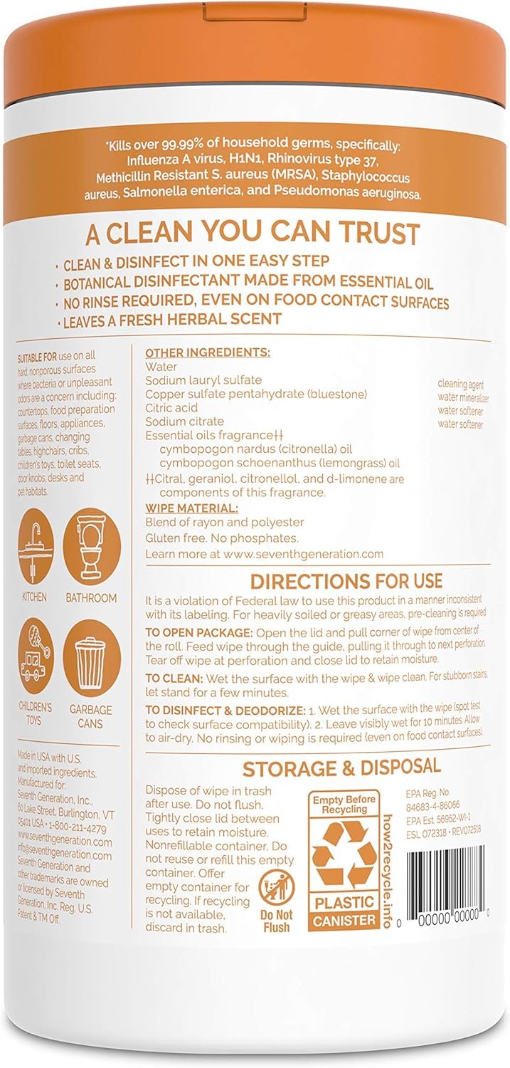 Clean doesn’t have to be complicated. Seventh Generation Disinfecting Wipes clean and disinfect in one easy step, killing 99.99% of household germs including cold and flu viruses* Our one-step disinfecting formula is designed for the hard, non-porous surfaces in every room in the house and does not require a rinse, even on food contact surfaces. The convenient wipes can be used for daily touch-ups or tough cleaning jobs. Our Lemongrass Citrus Scent Disinfectant cleaner is scented with essential oils and botanical ingredients and leave your home smelling fresh and clean. This EPA registered disinfectant can be used around kids and pets and is suitable for use on all hard non-porous surfaces including children’s toys, pacifiers, gym equipment, food contact surfaces, doorknobs, bathroom surfaces, and more. Seventh Generation is committed to being a brand of environmentally conscious and effective household and personal-care products. Our disinfectant wipes, sprays, and cleaners are solutions for the hard non-porous surfaces within your home. Make sure to try our other household cleaners to keep your home clean; stone cleaner, glass cleaner, granite cleaner, toilet bowl cleaner, bathroom tile cleaner, and all of our Seventh Generation products. A partnership with the CleanWell Company, makers of the disinfectant formula based on an essential oil, brings you a line of Seventh Generation Disinfecting wipes with CleanWell Inside. * Kills over 99.99% of household germs, specifically: Influenza A virus, H1N1, Rhinovirus type 37, Methicilin-resistant S. aureus (MRSA), Staphylococcus aureus, Salmonella enterica, and Pseudomonas aeruginosa on hard, non-porous surfaces.
