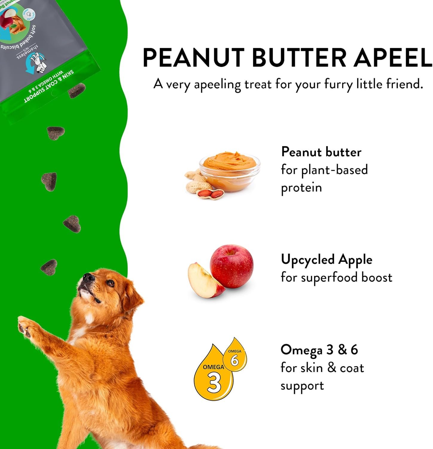 Soft Baked Biscuits: Shameless Pets Peanut Butter Apeel Soft Baked Biscuits are a healthy indulgence perfect for training any dog, from puppy to senior. Give your little monster one of these great treats to satisfy their cravings! A delicious combo of apples and peanut butter powered with plant-based pea protein and omega 3 and 6’s for healthy skin and coat support. Includes one 6oz pack of treats.