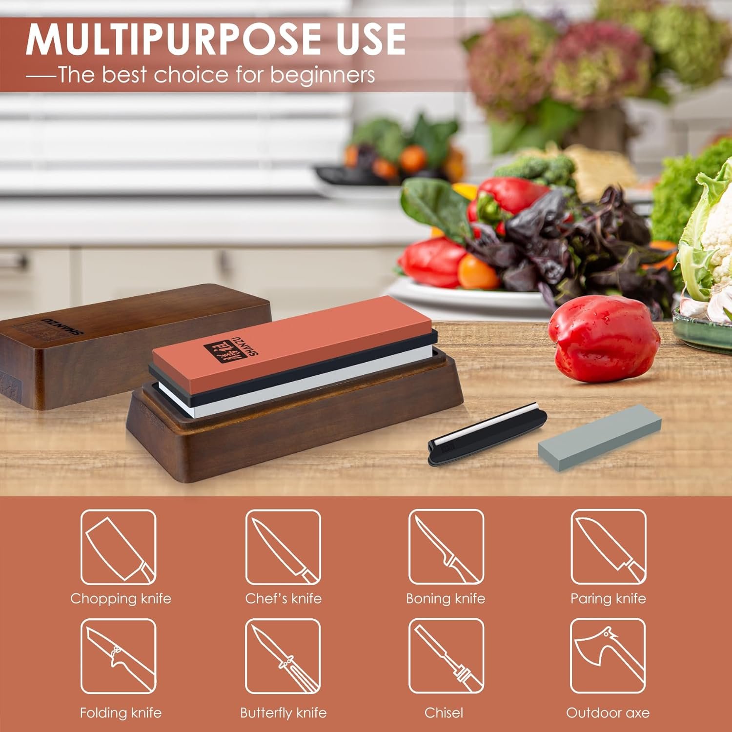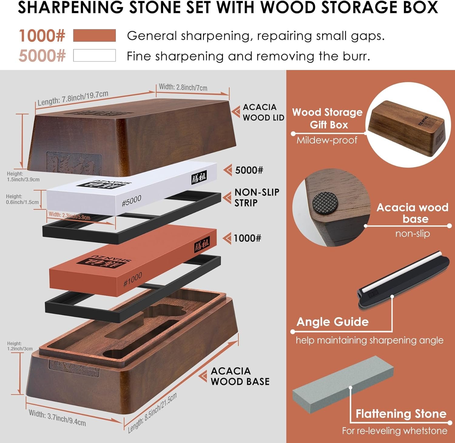 Safe and Easy to Use: Our water whetstone set is extremely user-friendly and easy to use. The knife sharpener stone kit is very easy to assemble and comes with a silicone base that holds the stone in the non-slip acacia wood base so that it doesn’t slip during work. The knife sharpening angle guide places your blade at the optimal angle for you and protects your fingers during the entire sharpening process