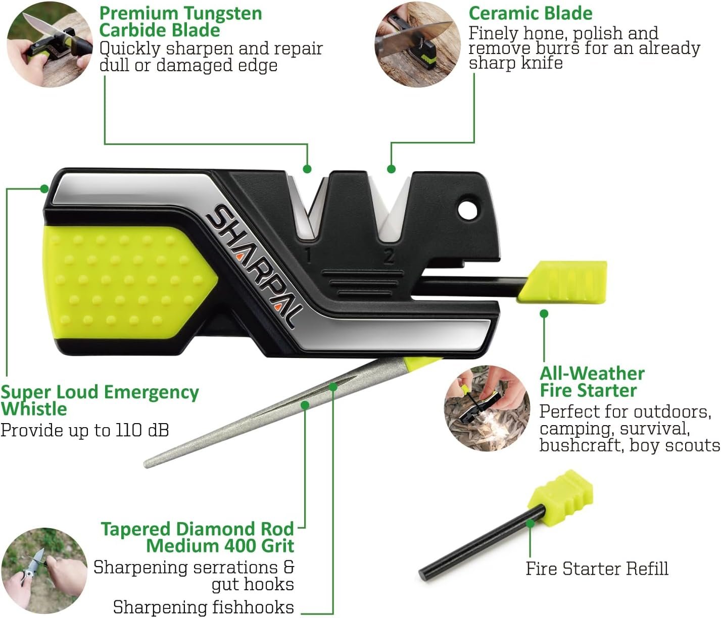 Tungsten carbide blades: quick edge settingCeramic blades: fine honingFire starterHigh-pitched emergency whistleTapered diamond rod (Medium 400 Grit): sharpening serrations, gut hooksGroove in diamond rod: sharpening fishhooks, pointed tools
