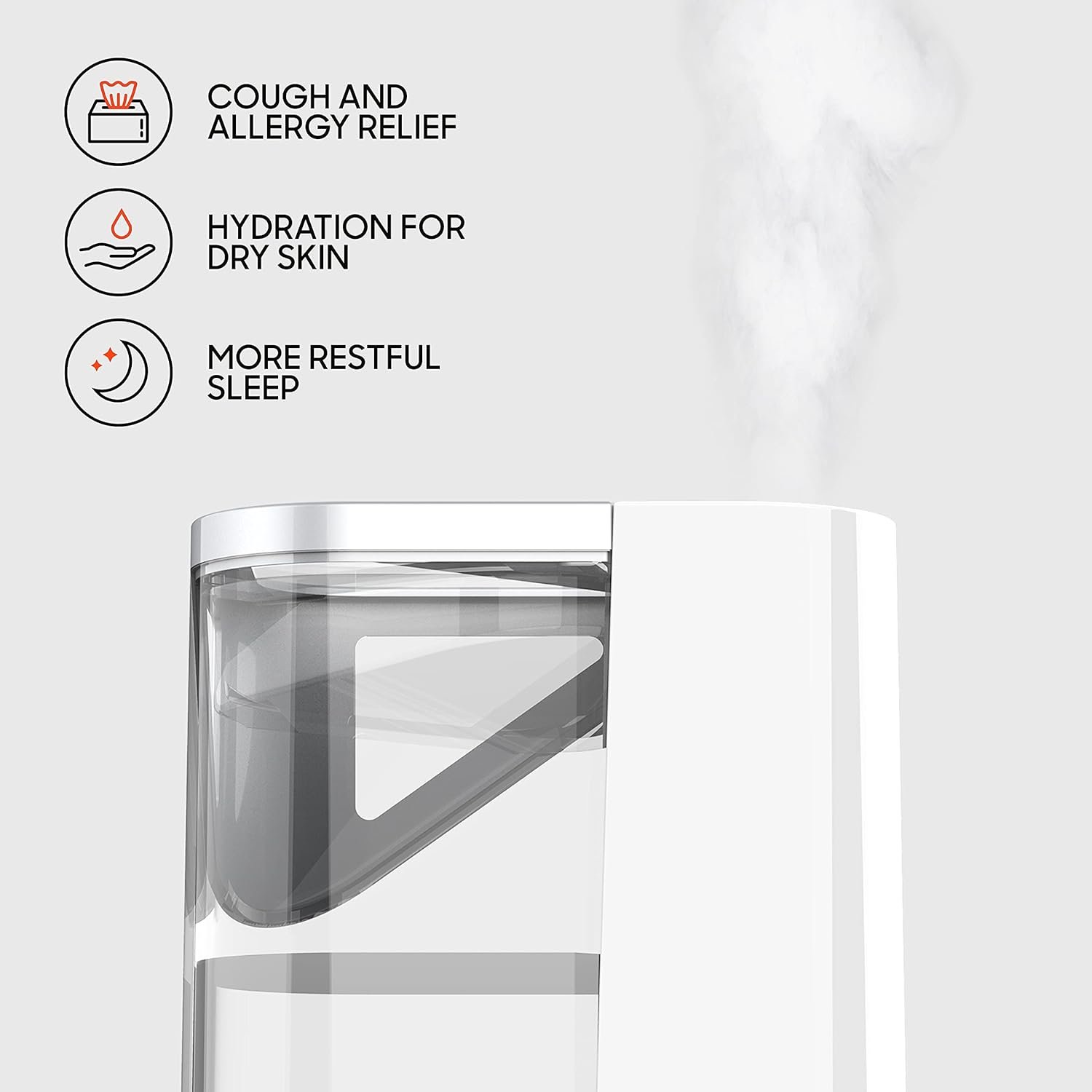 ULTRASONIC TECHNOLOGY: Filter-less and whisper-quiet ultrasonic humidification that helps clearing sinuses, coughs, soothes dry skin, and provides for a more restful sleep.