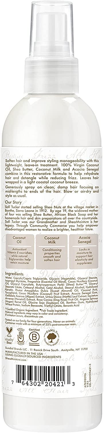 SheaMoisture 100% Virgin Coconut Oil Leave-In Treatment is a sulfate free conditioner that protects and controls frizz for all hair types. Soften hair and improve styling manageability with this lightweight, milk leave-in treatment.