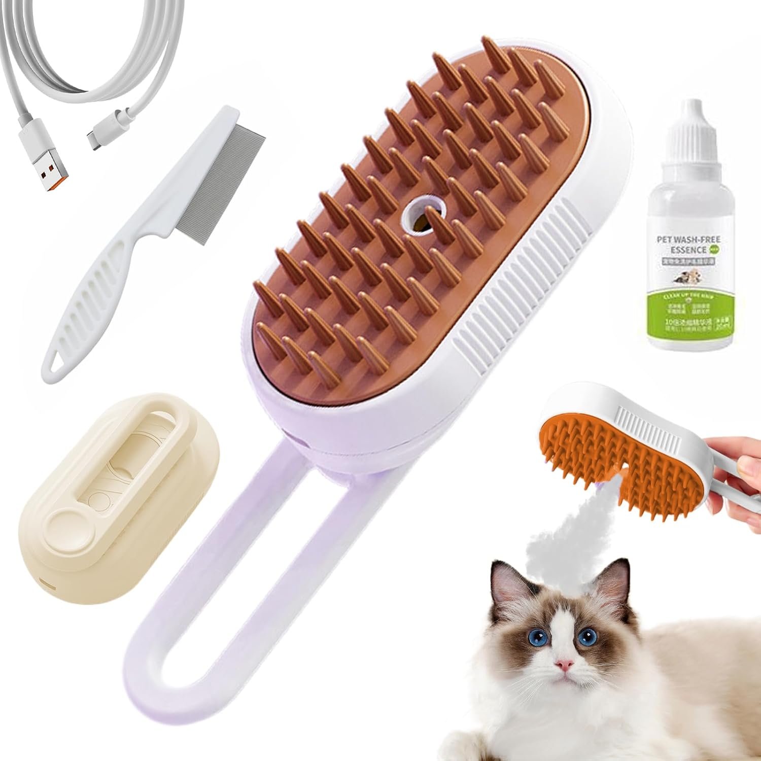 Cloud Care Cat Brush, 2024 Best Cat Steam Brush, Pet Steam Cat Brush, 3-in-1 Self-Cleaning Cat Brush with 360° Rotating Arm, Detachable Silicone Bristle Brush