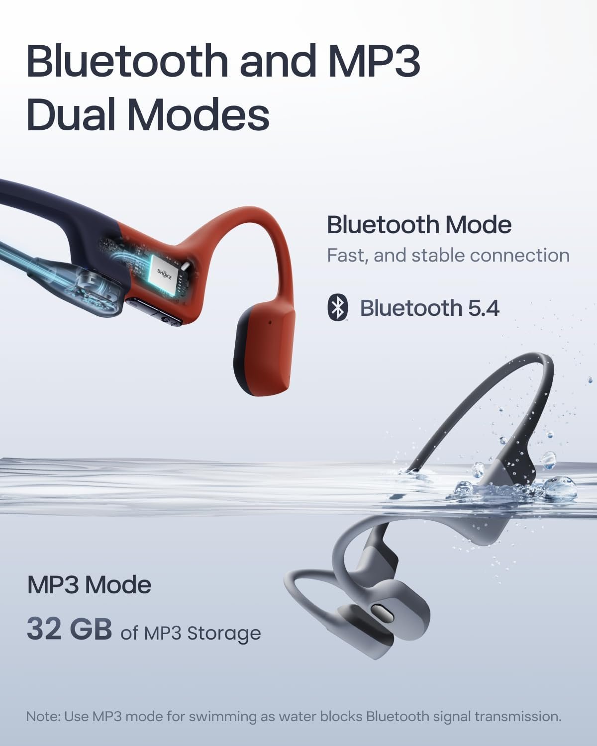 Bluetooth + MP3 Modes + Shokz App – Stream Bluetooth music and podcasts, or listen phone-free with internal MP3 storage for up to 8,000 songs. Toggle between modes and tailor your audio experience with the Shokz App.