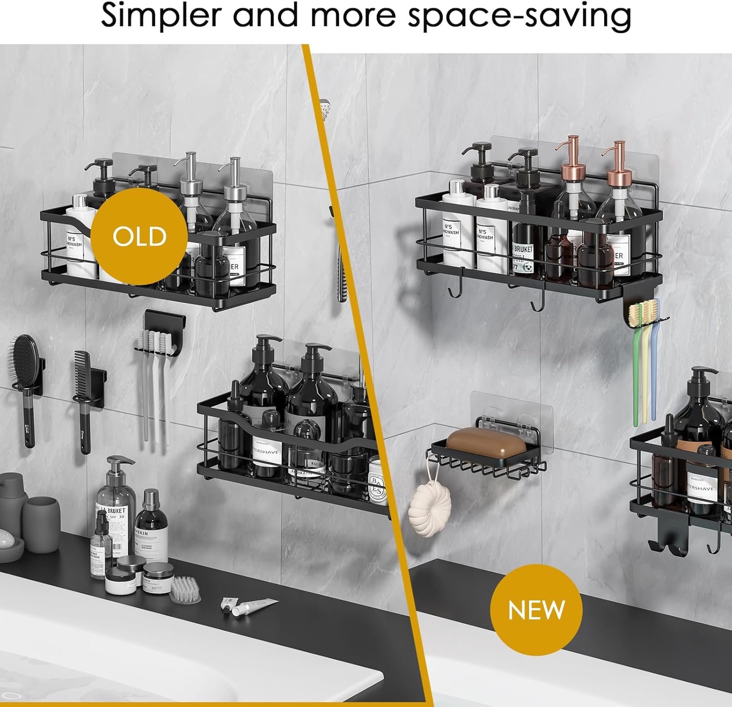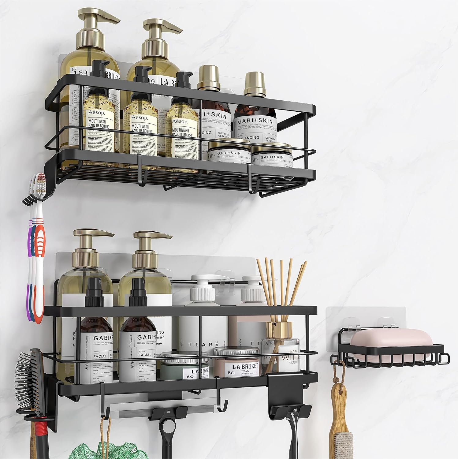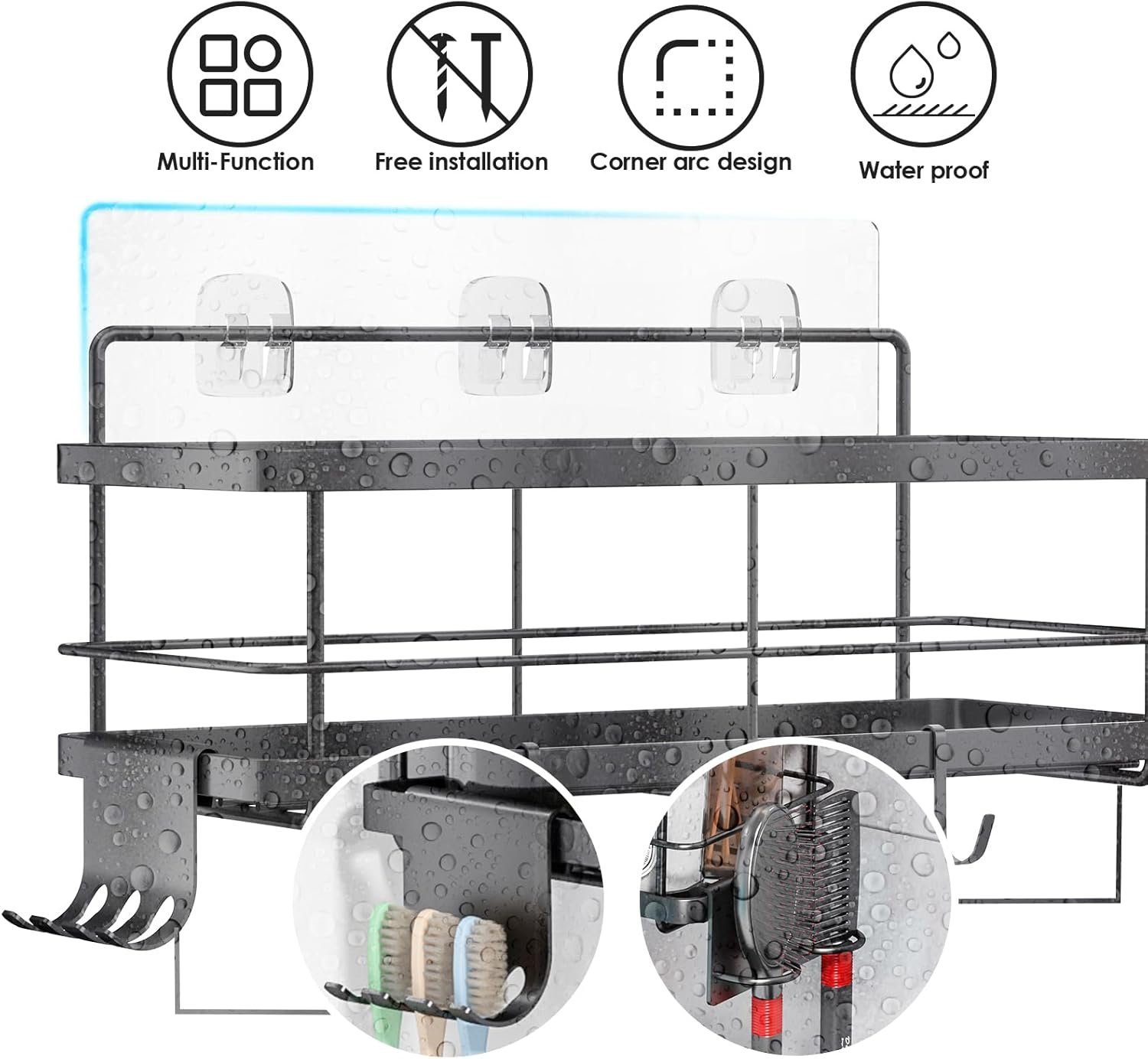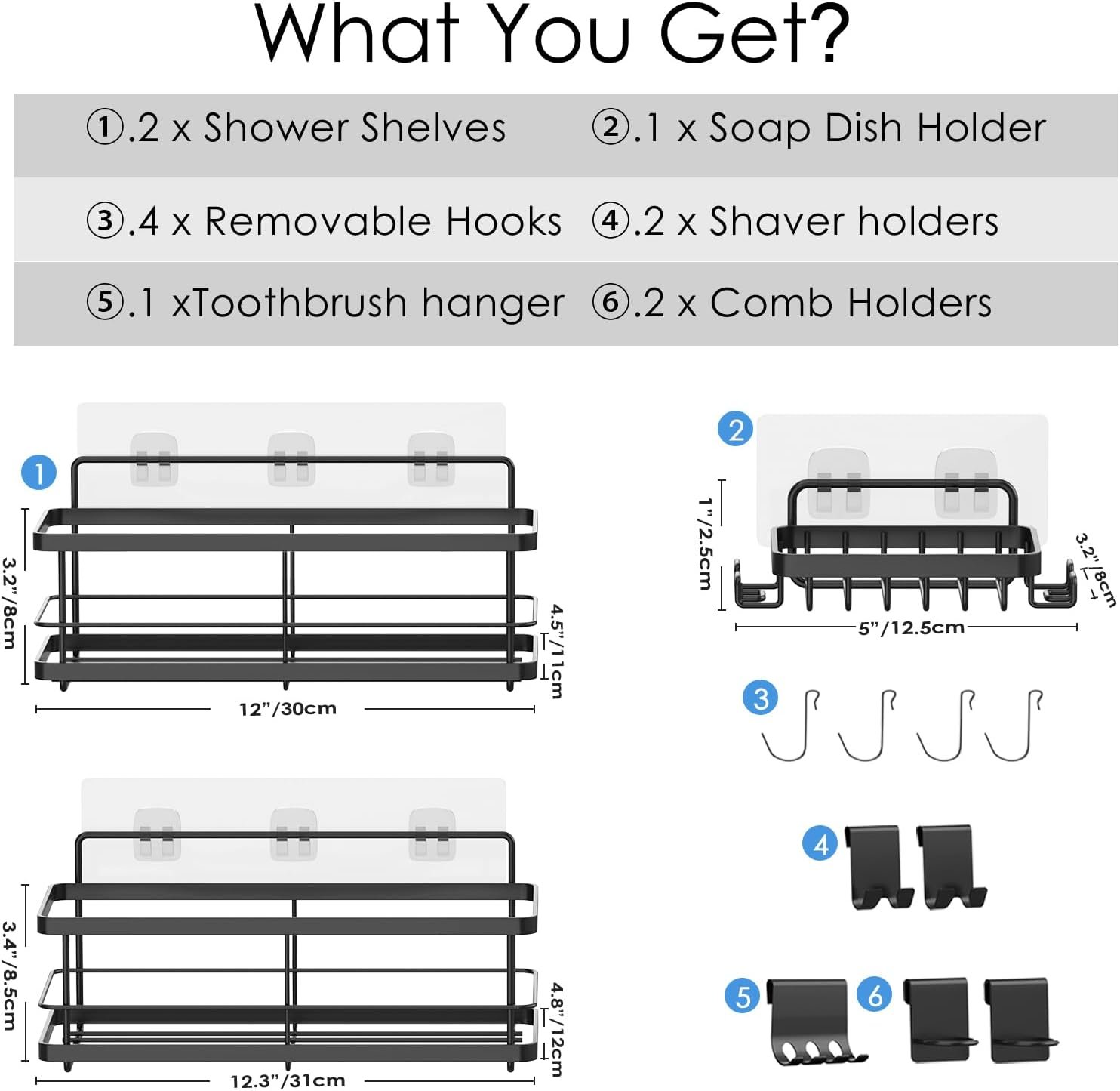 【What You Get】 2*Shower Caddies, 1*Soap Dish, 4*Adhesives, 2*Comb holders, 1*Toothbrush holder, 2*Razor holders, 4*Hanging Hooks, 1*User Manual.