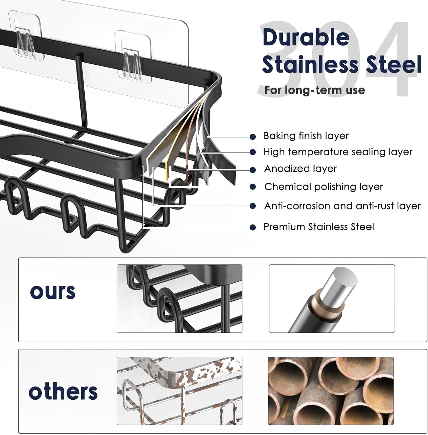 Durable Rust-Resistant Stainless Steel: Expertly crafted from top-grade 304 stainless steel, with powder-coated process, bathroom shower shelves are tough, durable, stable, rustproof and scratch-proof. NESOMI shower rack rustproof powder-coated and solid frame wire are significantly thicker, ensuring long-lasting use. It can withstand humid conditions for up to 8 years and is backed by a 8-year warranty. Hollow design ensures ventilation and drainage, easy to keep clean