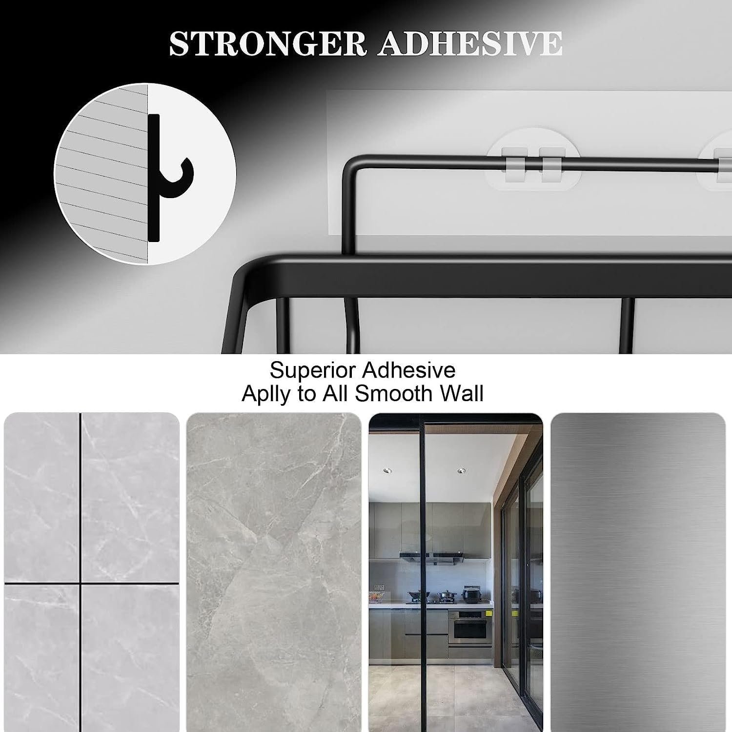 【Super Strong Viscosity Adhesives】Our shower caddies provide an upgraded version of transparent non-marking adhesive with superior stability which capacity can reach up to 40lb without drilling.( Stronger than suction up shower shelves)And we provide 3 big adhesive sticker and 2 small adhesives for each of shower shelf.( Renter friendly Tip: Use a hair dryer to heat it up before tearing it off)
