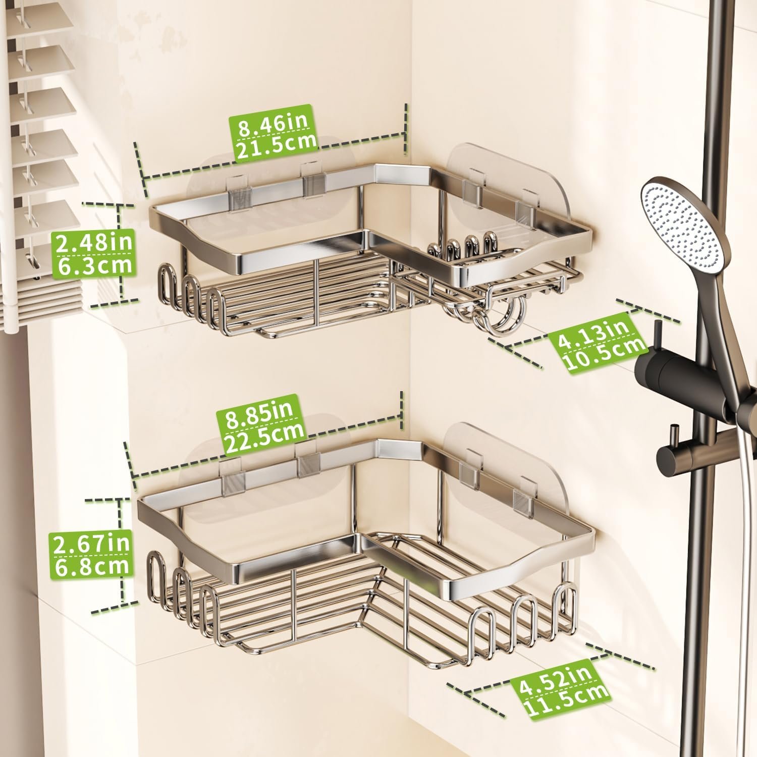 [Large Capacity Corner Shower Shelf]: The size of this shower corner caddy: L- 9.3 × 9.3 × 3.9 in, M-8.7 × 8.7 × 3.7 in, two shower shelves will provide large space to store and organize your daily supplies in the bathroom or kitchen