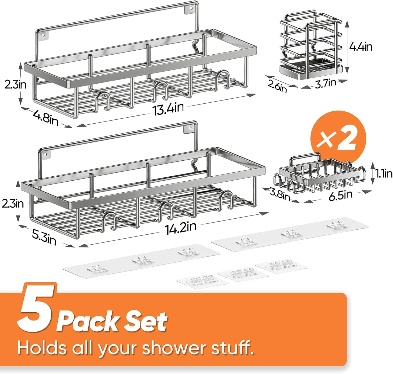【5 Piece Shower Organizer Set】:Our bathroom shower shelves set include 2 shower caddies、2 soap holder 、2 toothbrush holder and 5 adhesives. The large storage capacity of 14.2in×5.3in bathroom organizer shower can store all of your bath essentials. Also, the shower rack is suitable for the bathroom, kitchen, toolroom, etc. Make use of the vertical space on the wall, not only increasing storage space, but also adding decoration and beauty.