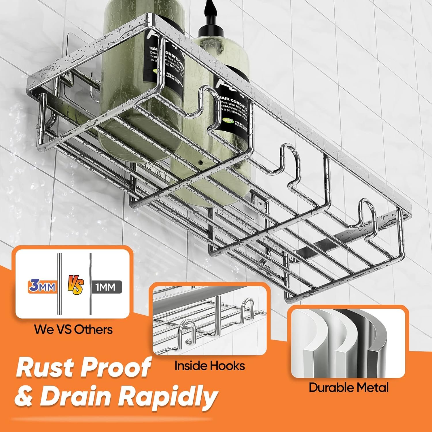 【Strong Adhesive】:There is absolutely no need to worry about the load-bearing capacity of this adhesive shower caddy. With the Waterproof and Stronger Adhesive, this caddy can hold up to 40 pounds. The shower storage secures firmly via a durable, traceless adhesive that won’t damage the shower wall. Grip tightly to smooth surfaces, with no worry about falling down. If drilled, hold more capacity.