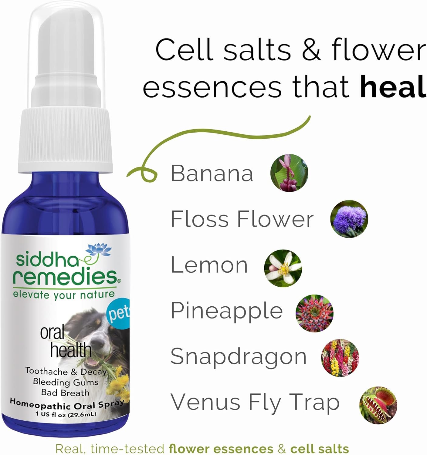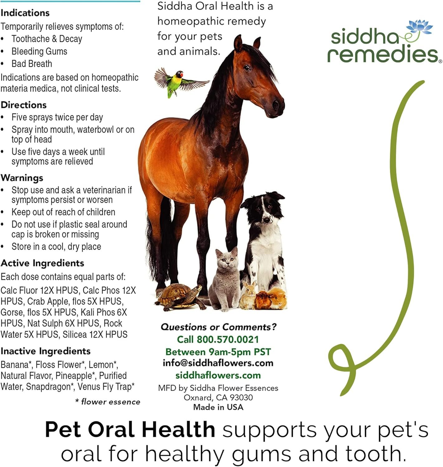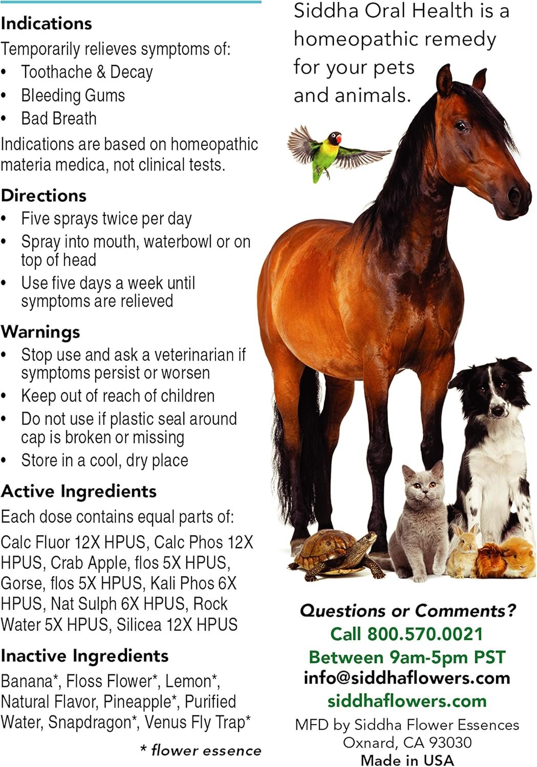 Siddha Oral Health increases the animal’s receptivity toward oral hygiene. Temporarily relieves symptoms of: Tooth Decay, Toothache, Bleeding Gums, Bad Breath. It also helps the animal toward acid/alkaline balance (a big factor in decay), plaque and other dental problems.