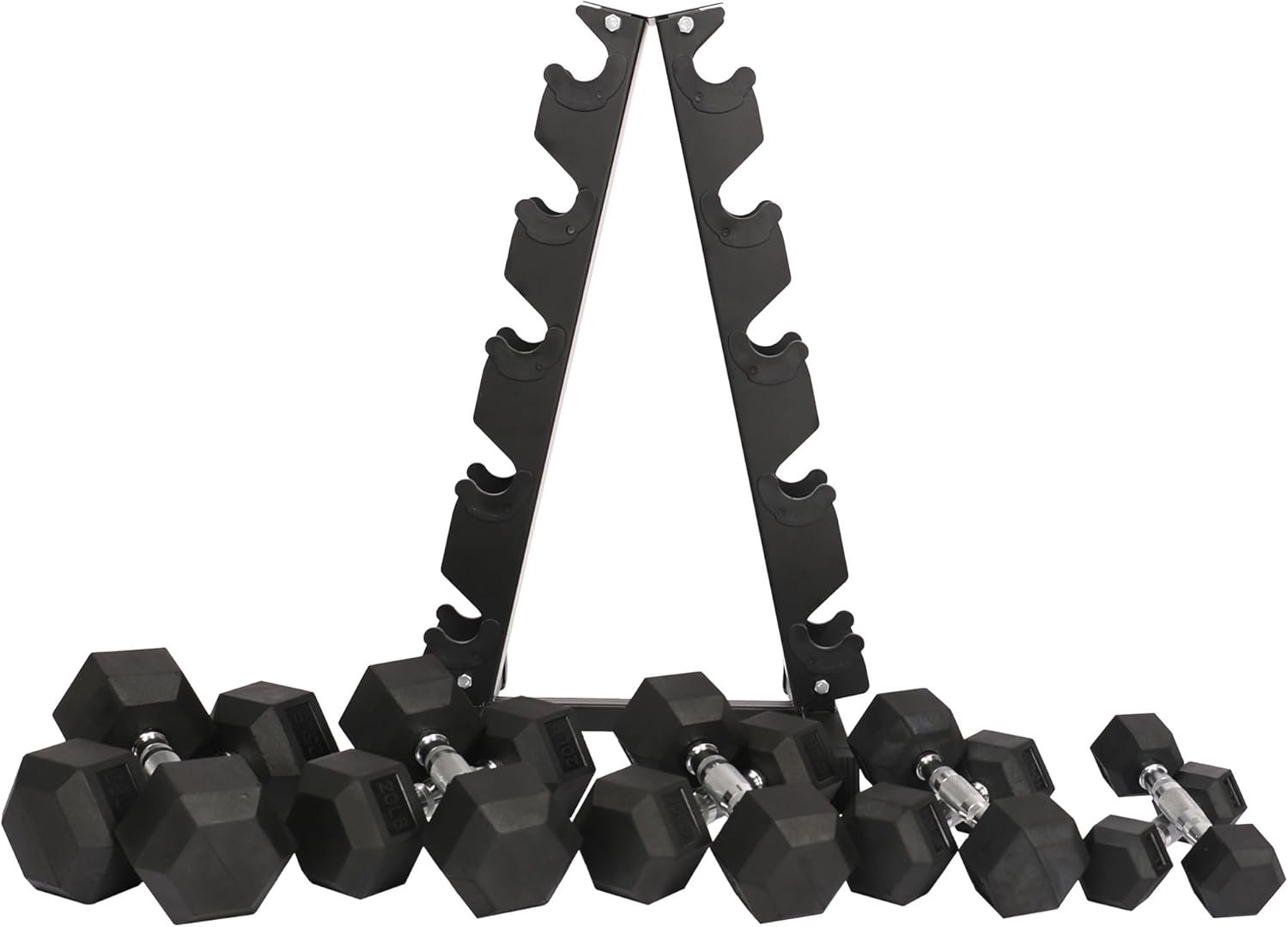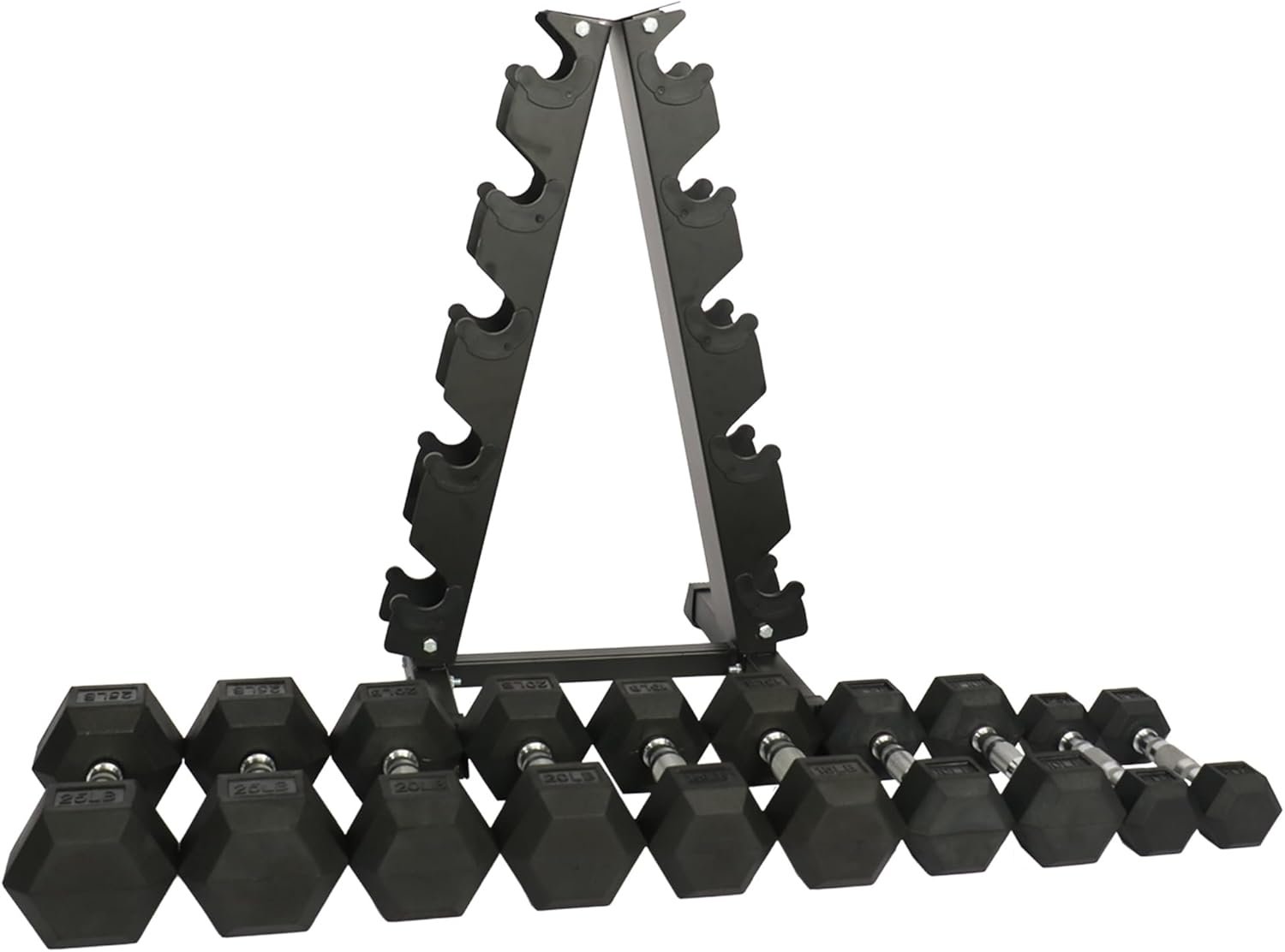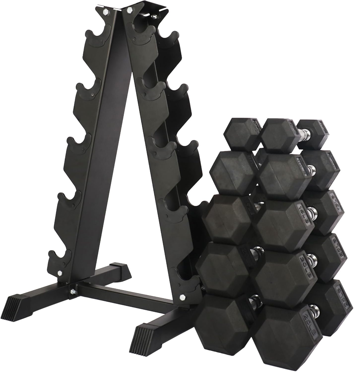 150 pounds set: 1x A-Frame rack (5-tier), pair of 5lbs, 10lbs, 15lbs, 20lbs and 25lbs