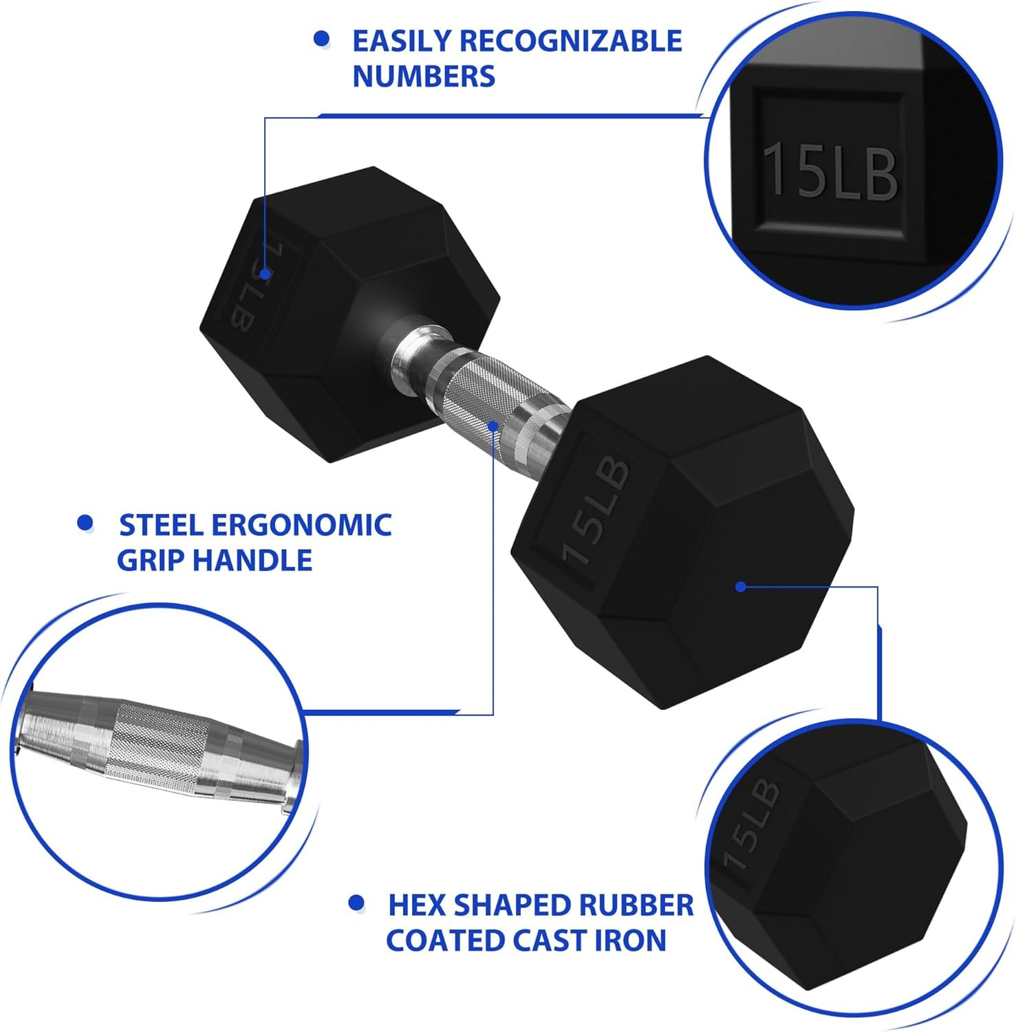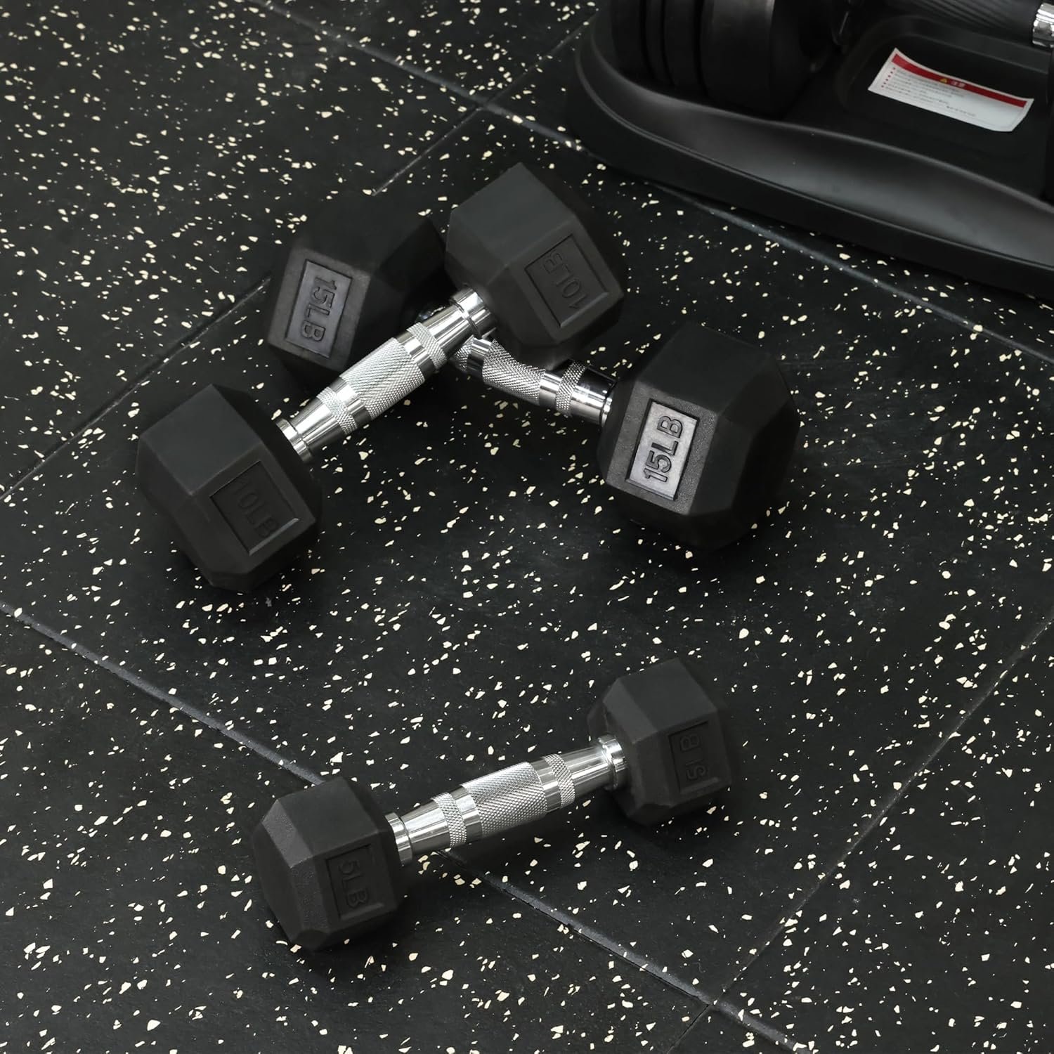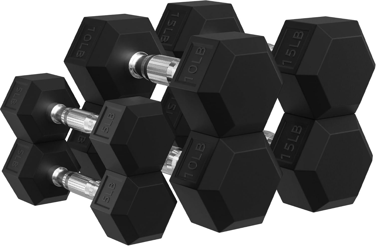 Signature Fitness Premium Rubber Encased Hex Dumbbell, 60-Pound Set Including A Pair of 5, 10 and 15 Pound