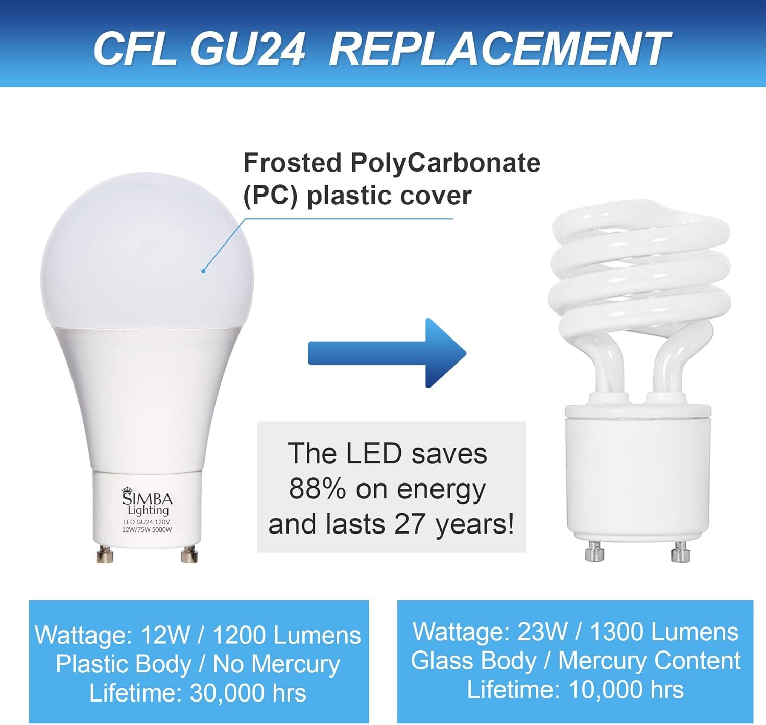 ENERGY SAVING LONG LIFESPAN: 88% Energy Saving, Reduced Average Household Energy Costs to only $1.4 per Year! Lifespan of 30,000 Hours, 27 Years with 3 Hour Daily Use. California Title 20 Certified