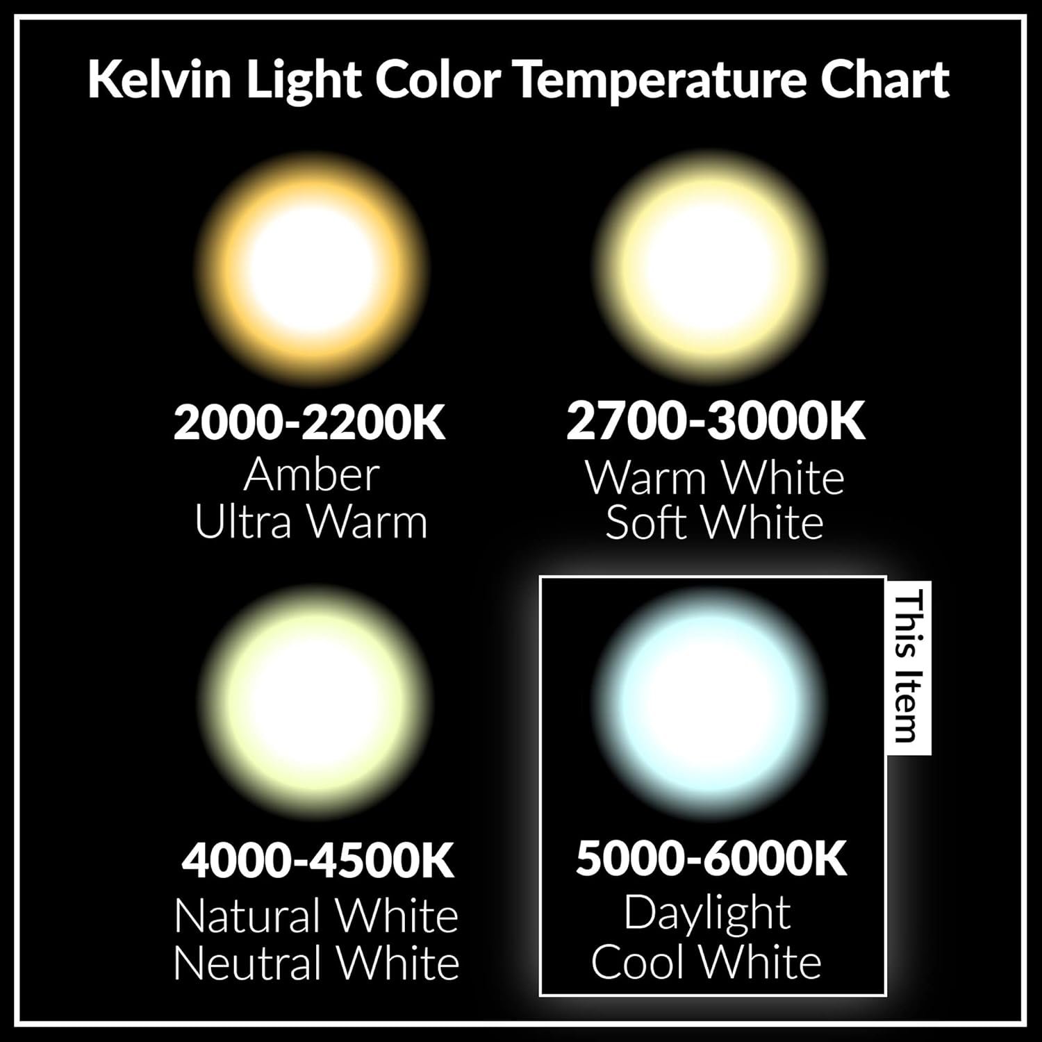These LED light bulbs output 5000K light temperature, which is considered daylight or cool white. The glow is bright white and slightly bluish, extending your daylight hours.