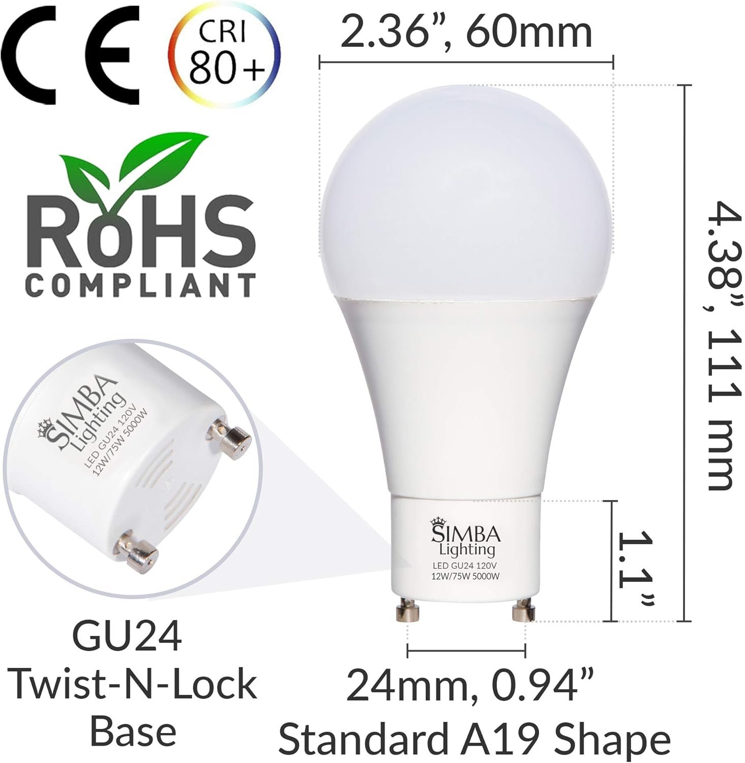 Base: GU24 Twist & Lock with 24mm distance between the 2 prongsShape: Standard A19 BulbDiameter: 2.36 inchesLength: 4.38 inches
