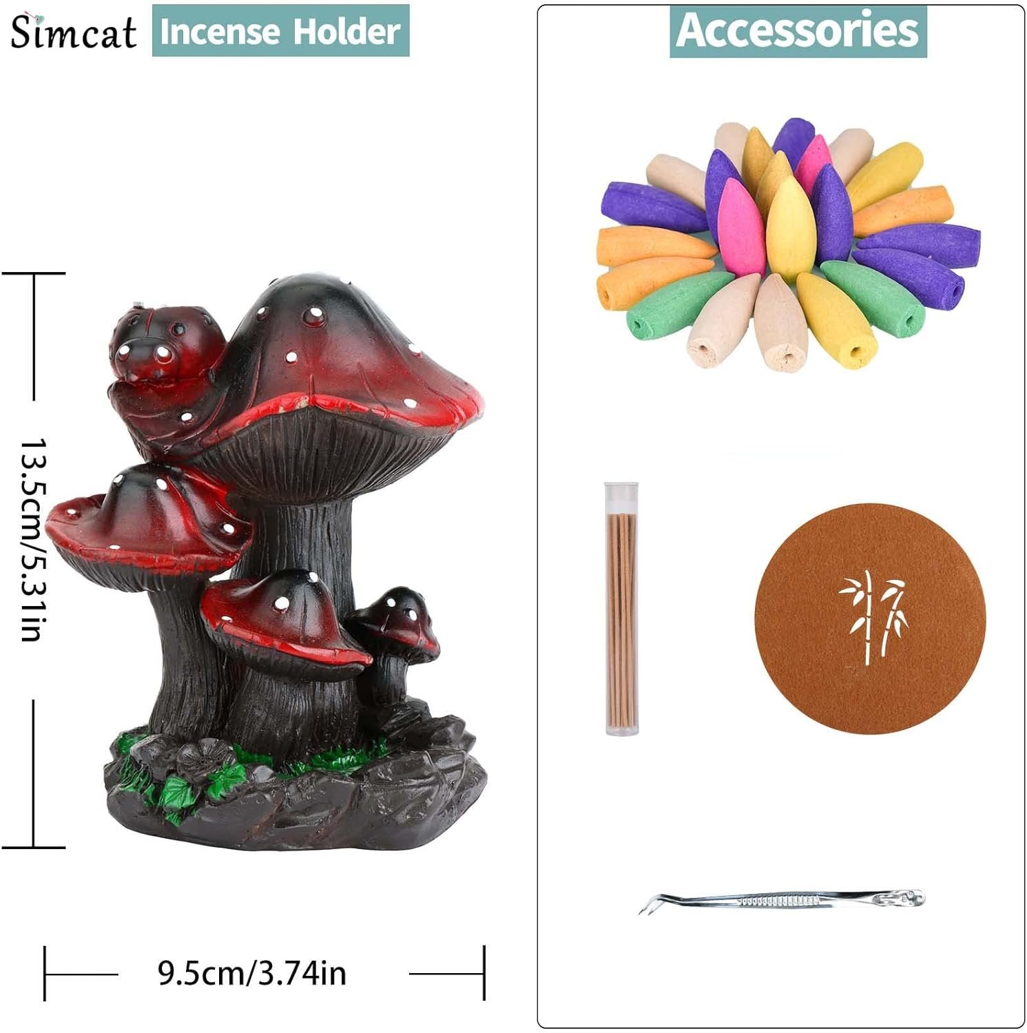 【What You Get】Simcat resin backflow incense burner kit is paired with approx 20 backflow incense cones, 30 incense sticks, and 1 tweezer, 1 mat. If the mushroom incense burner you ceceived is broken or missing incense cones, please contact us for replacement.