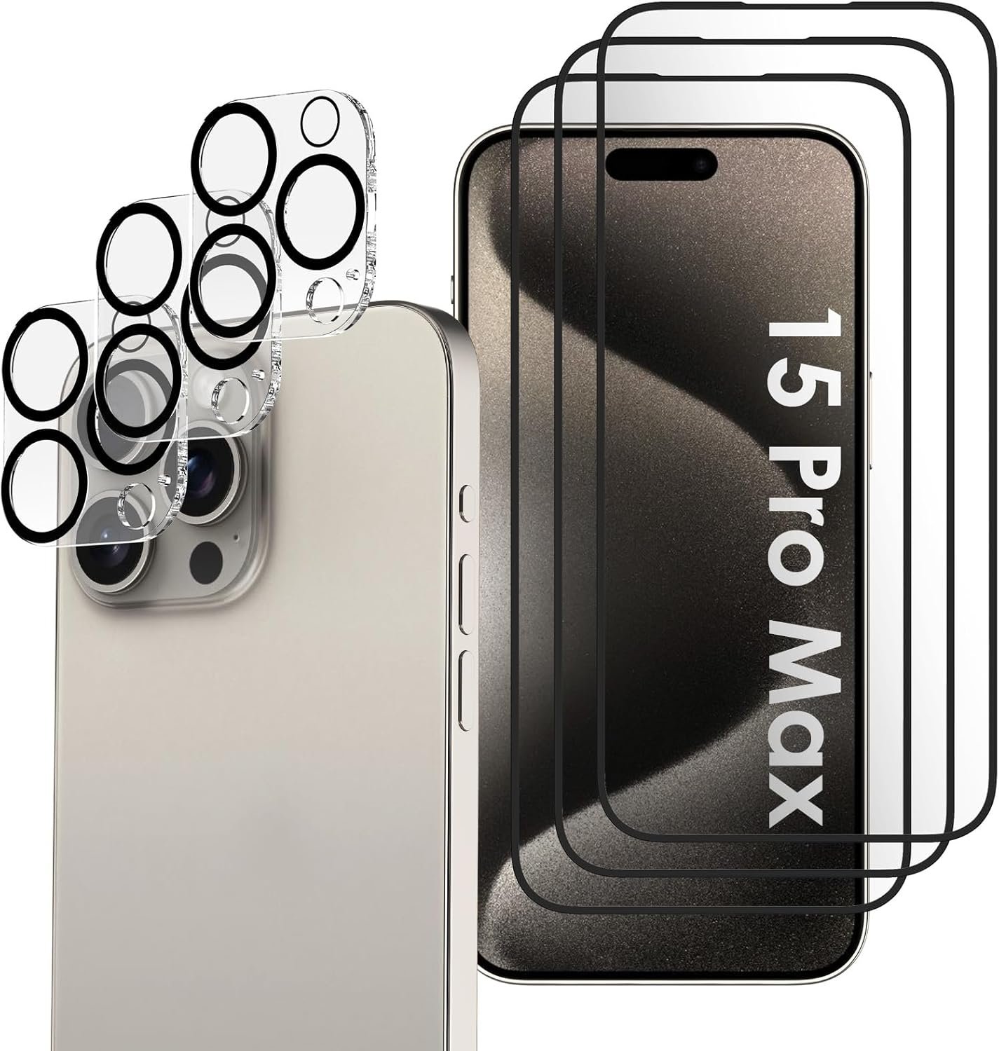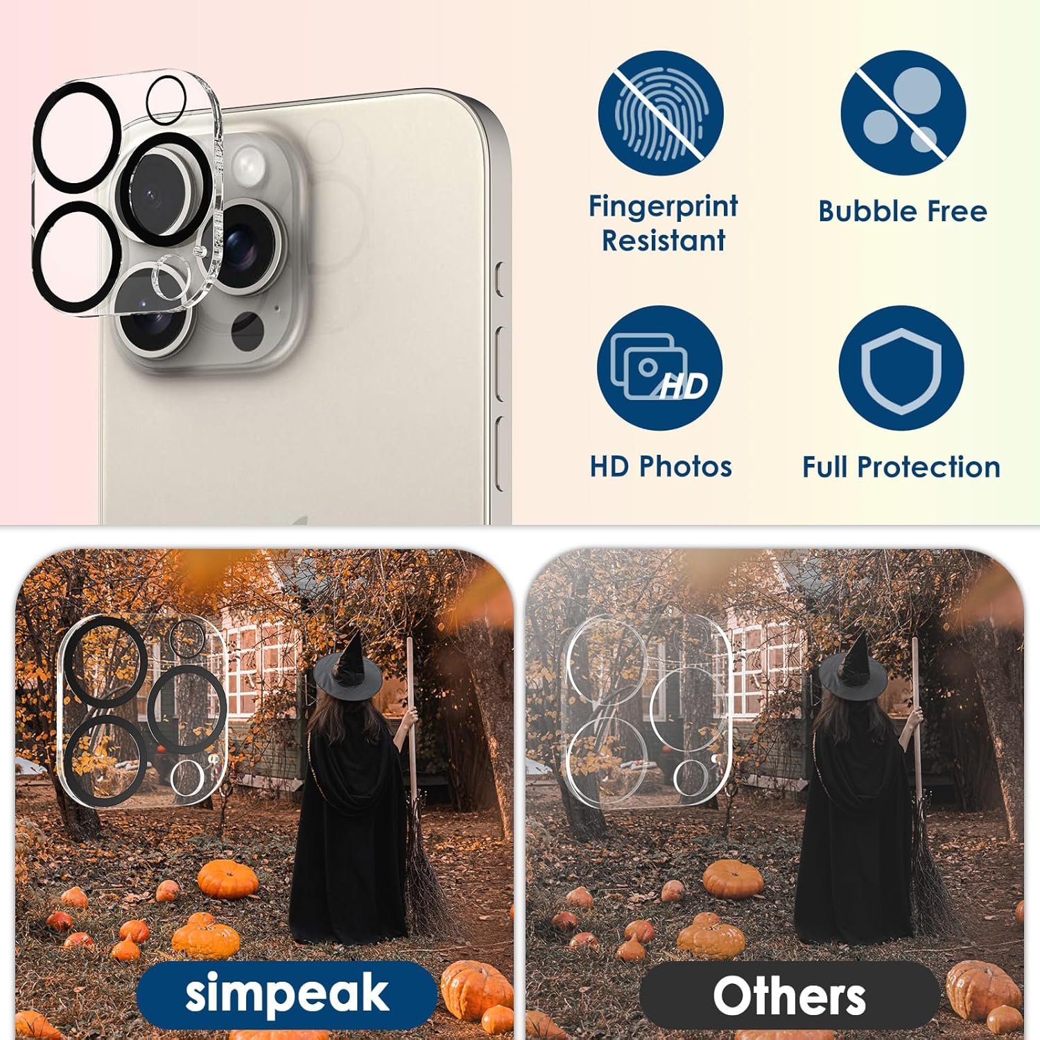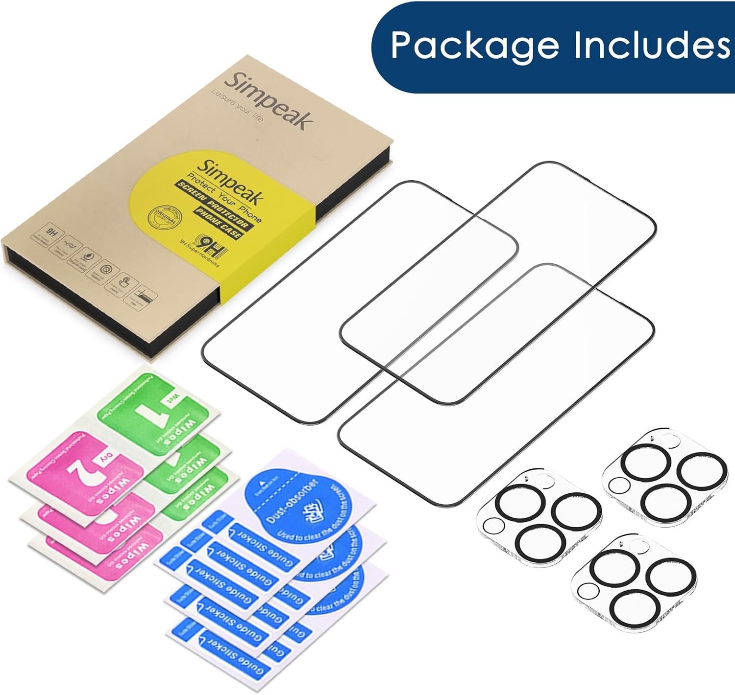 Simpeak 3Pack Screen Protector Compatible With iPhone 15 Pro Max (6.7″) + 3Pack Clear Camera Lens Protector Compatible With iPhone 15 Pro Max (2023), Full Protection,HD Tempered Glass Film,9H Hardness