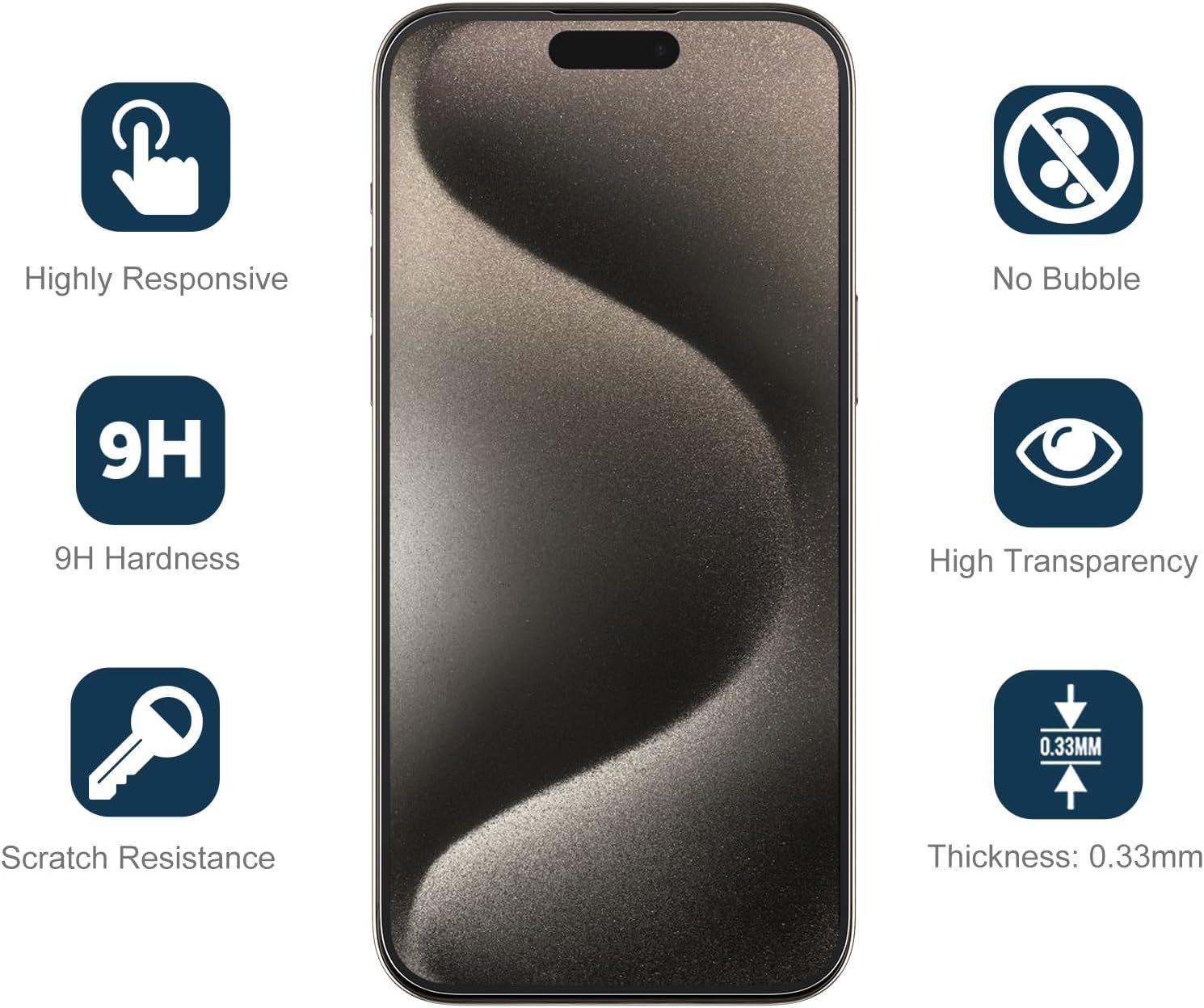 1. 📱 [Maximum protection compatible with iPhone 15 Pro Max 6.7″ ] Screen protector made of tempered glass. After a drop resistance test, we have been able to verify that your phone will be well protected. No scratches, cracks, no damage to the screen, anti-fingerprint, dustproof and waterproof.