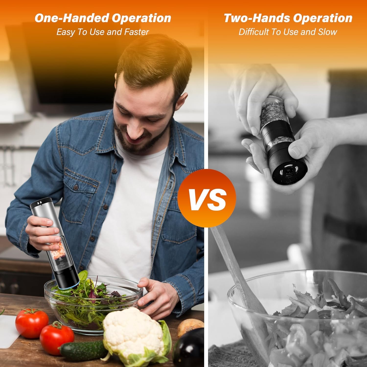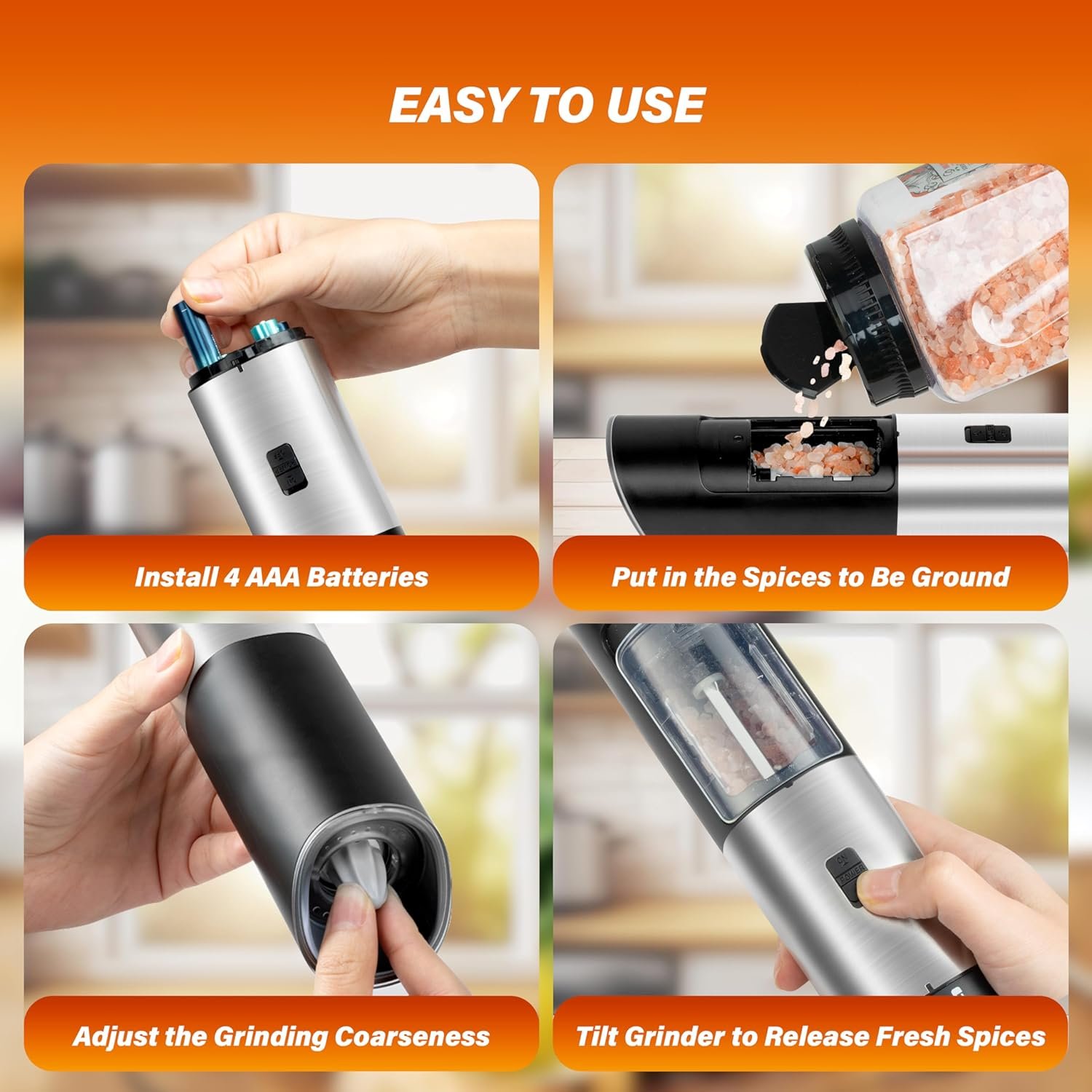 【Gravity Sensor Design & Battery Operated】 Electric salt and pepper grinder set adopts gravity induction design, requires 4x AAA batteries (not included). Just simply flipped the grinder with one hand and you will get fresh spices. Easy to use.