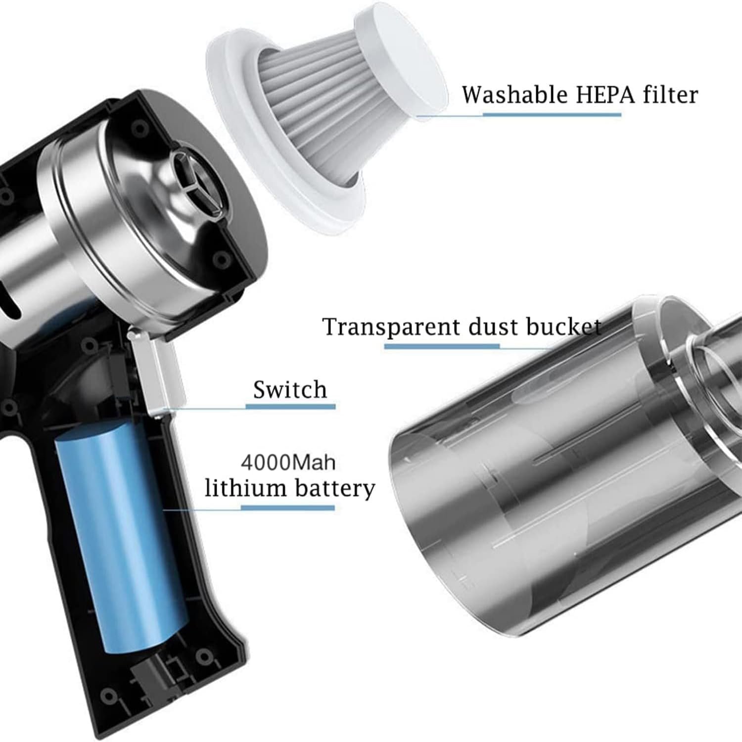 【Cordless & rechargeable】USB Rechargeable, the car vacuum car cleaner cordless has a built-in 6000mAh rechargeable lithium battery, can work continuously for 20-30 minutes, and it can be fully charged in 3-4 hours. Comes with a charging cable, which can be connected to a laptop computer, car USB port charging, mobile power supply, etc.