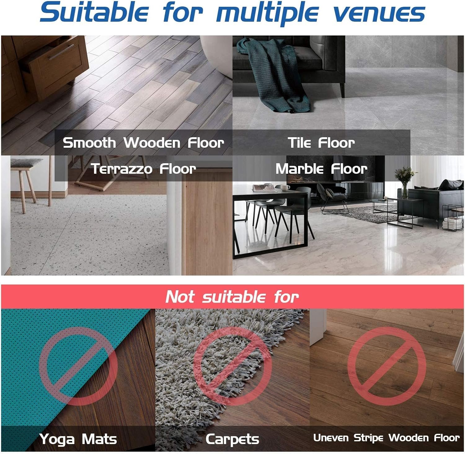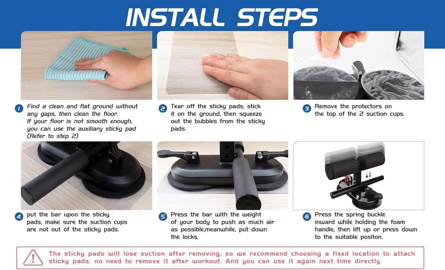 🏋️♂️【NOTE】: Wooden floors and any smooth floors that try but can’t suck. 💪𝗣𝗹𝗲𝗮𝘀𝗲 𝗽𝘂𝘁 𝘁𝗵𝗲 𝘀𝘁𝗶𝗰𝗸𝗲𝗿 𝗼𝗻 𝘁𝗵𝗲 𝗳𝗹𝗼𝗼𝗿 𝗳𝗶𝗿𝘀𝘁. Then follow the steps to suck the product onto the sticker! This will make the product incredibly stable!