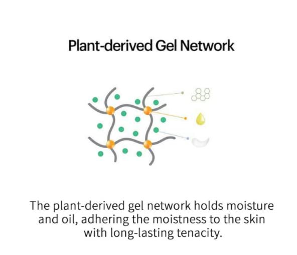 Plant-derived Gel Network – The plant-derived gel network holds moisture and oil, adhering the moistness to the skin with long-lasting tenacity.