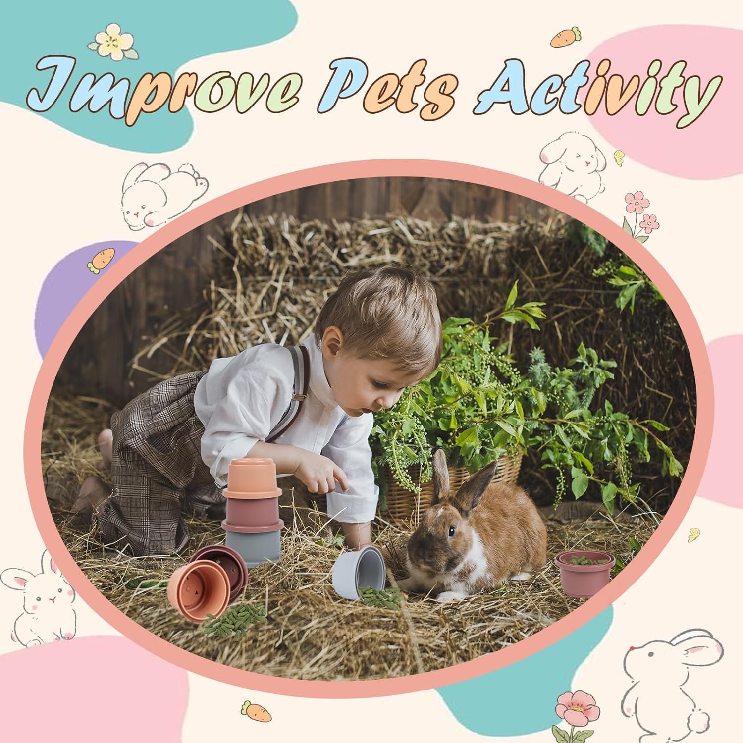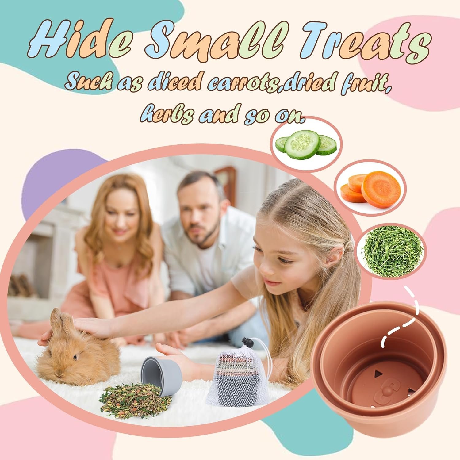 Stacking Cups for Rabbits: Bunny chewing toys with 8 colors are nested with each other, looking like beautiful and attractive rainbow. (Please note that the color of the cups with different sizes is random.) Not only are these treat toys easy to store and don’t take up much space, but they are light enough that rabbits can throw them around with their teeth. After the feeding game, pet owners just need to wash and clean the cups with warm water and soap.