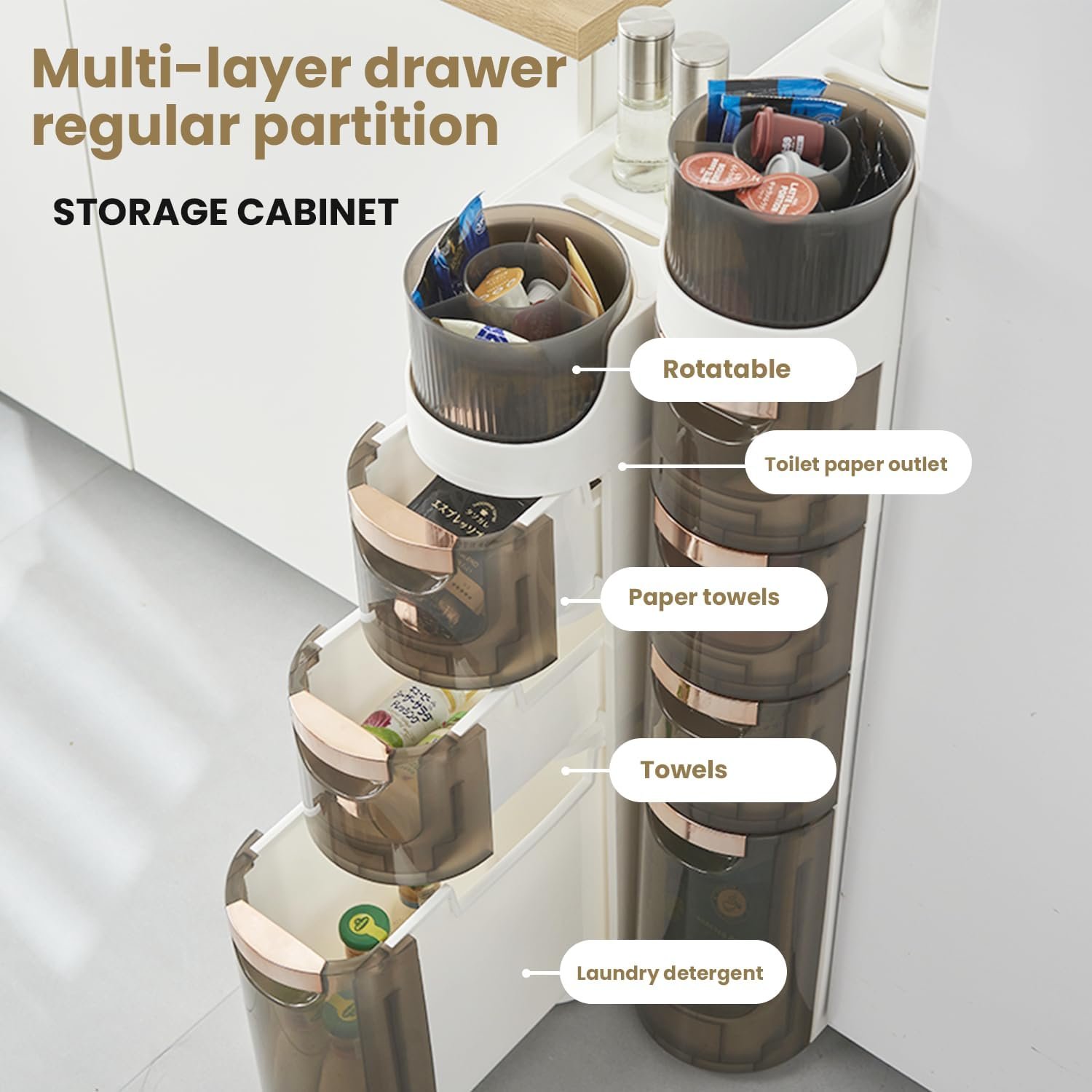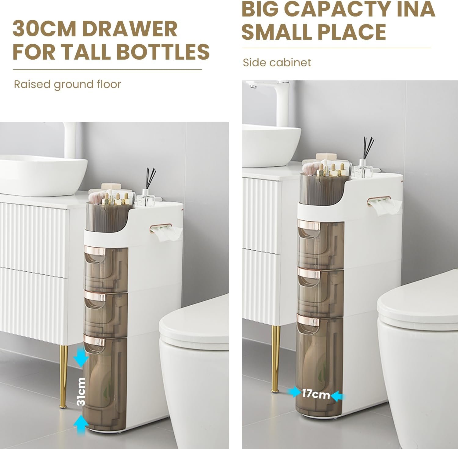 💧【Multi-layered partitions】It has three transparent drawers, with the bottom one being taller and can hold laundry detergent bottles up to 31cm high. The drawers’ transparency makes it easy to identify and access stored items.