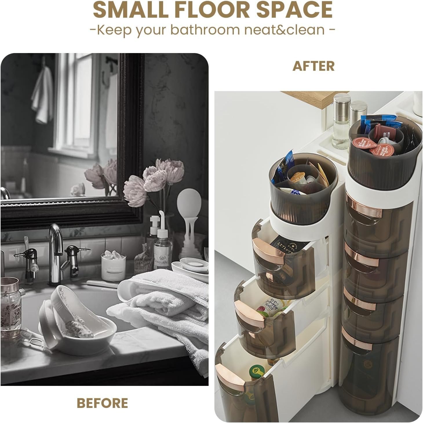 💧【Small Size&Large Capacity】This storage cabinet is designed to fit into small spaces. It is tall and slim but has plenty of room to store your belongings. You can slide it into tight gaps, like between the fridge and wall or the washing machine and toilet. It’s a convenient way to keep your bathroom clutter-free.