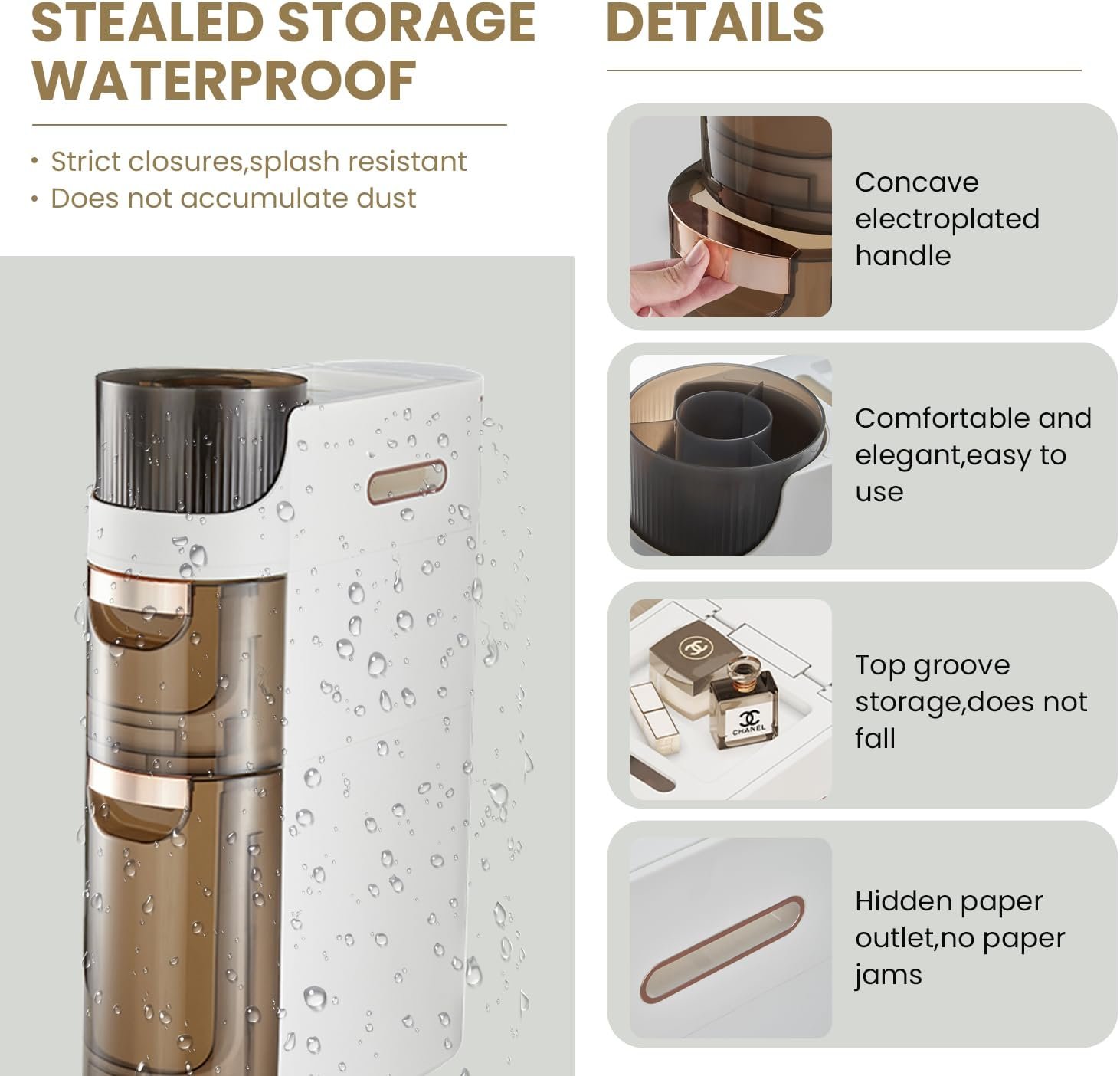 The organizer tray is designed to organize small partsThe top compartment is very suitable for placing mobile phones, perfume, small plants and other ornaments. Perfect for preventing your smartphone from falling into the toilet.