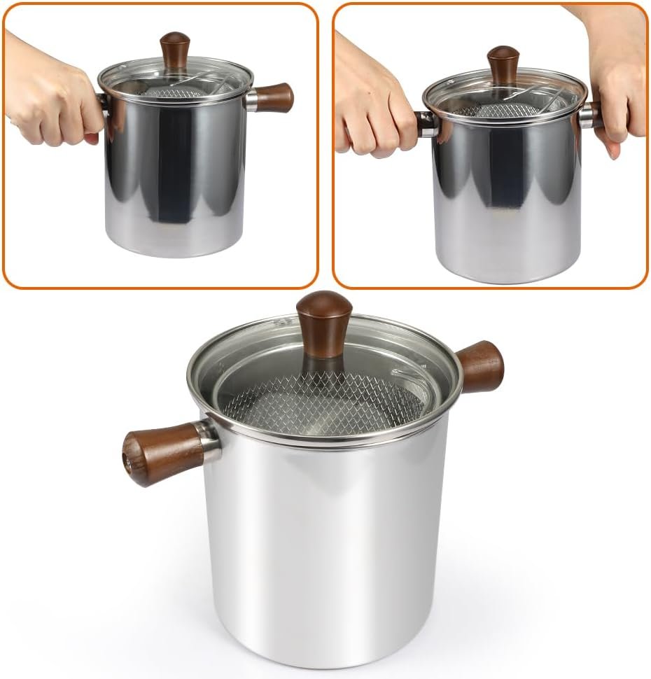 Package Included: heavy 304 stainless steel pot with two wooden handles, 1X glass lid,1X stainless steel frying basket