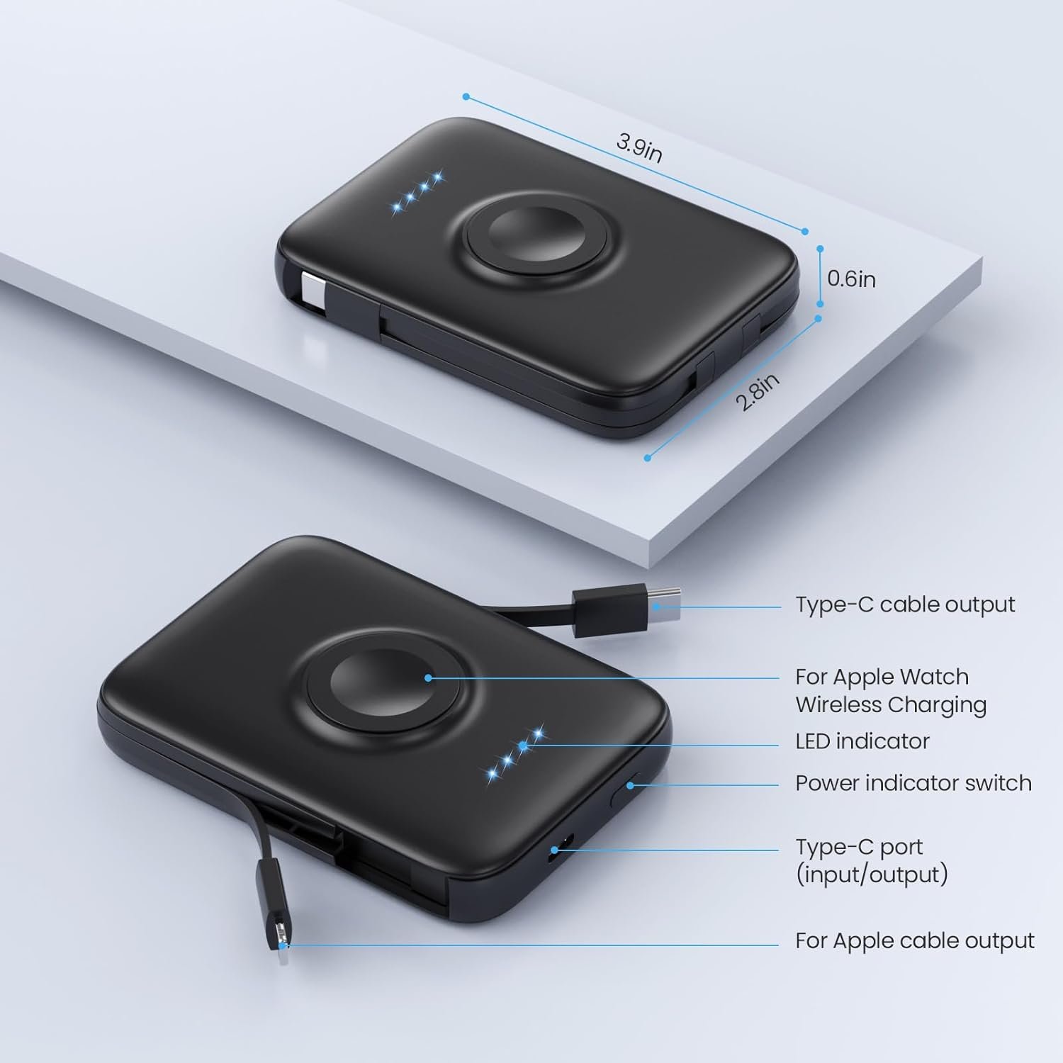 【Portable Charger for Apple Watch 】Portable charger has a wireless charging sensor panel that can charge for iwatch, Embedded two data cables (Built-in Type-c cable and apple interface cable supports charging of all cellphone, Compatible with iWatch Ultra 9/8/7/6 /Se/5/4/3/2 / iPhone15/14/13/12/12 Pro Max / 11 / Samsung Galaxy 23/22/21/Pixel/Nexus/ tablet series.