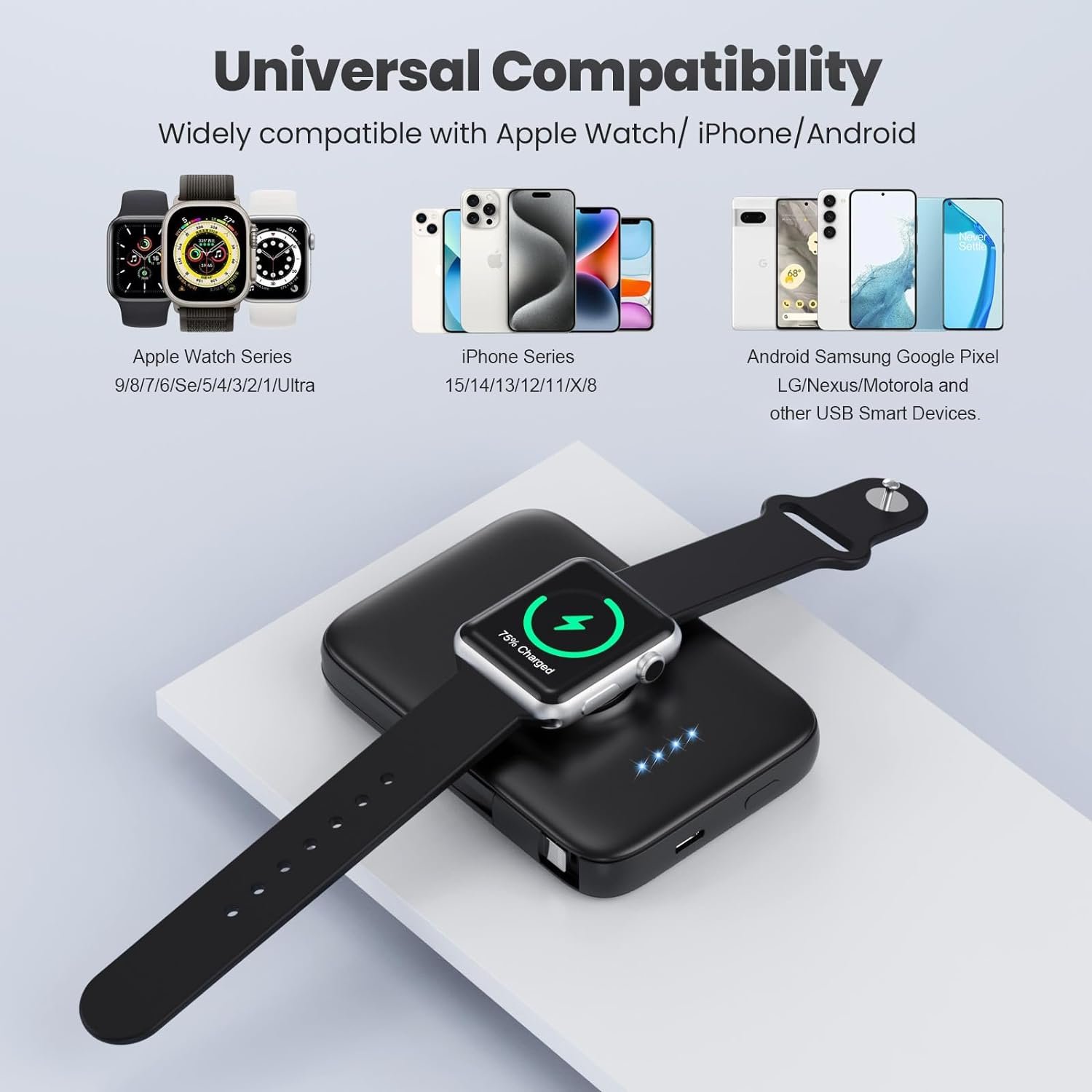 【Portable Charger for Apple Watch/ iPhone/Android】the Portable Charger is compatible with Apple Watch 45/44/42/41/40/38mm, including Apple Watch Series Ultra SE 9, 8, 7, 6, 5, 4, 3, 2, 1, Apple Watch Sport as well as Compatible with iPhone15/14/13/12/12 Pro Max/ 11/6s and Android Samsung Galaxy Pixel Nexus ect,Charge Multiple Devices at the same time- Built in cable and integrated magnetic charger module, Makes you power Apple Watch, iPhone and android simultaneously for added convenience.