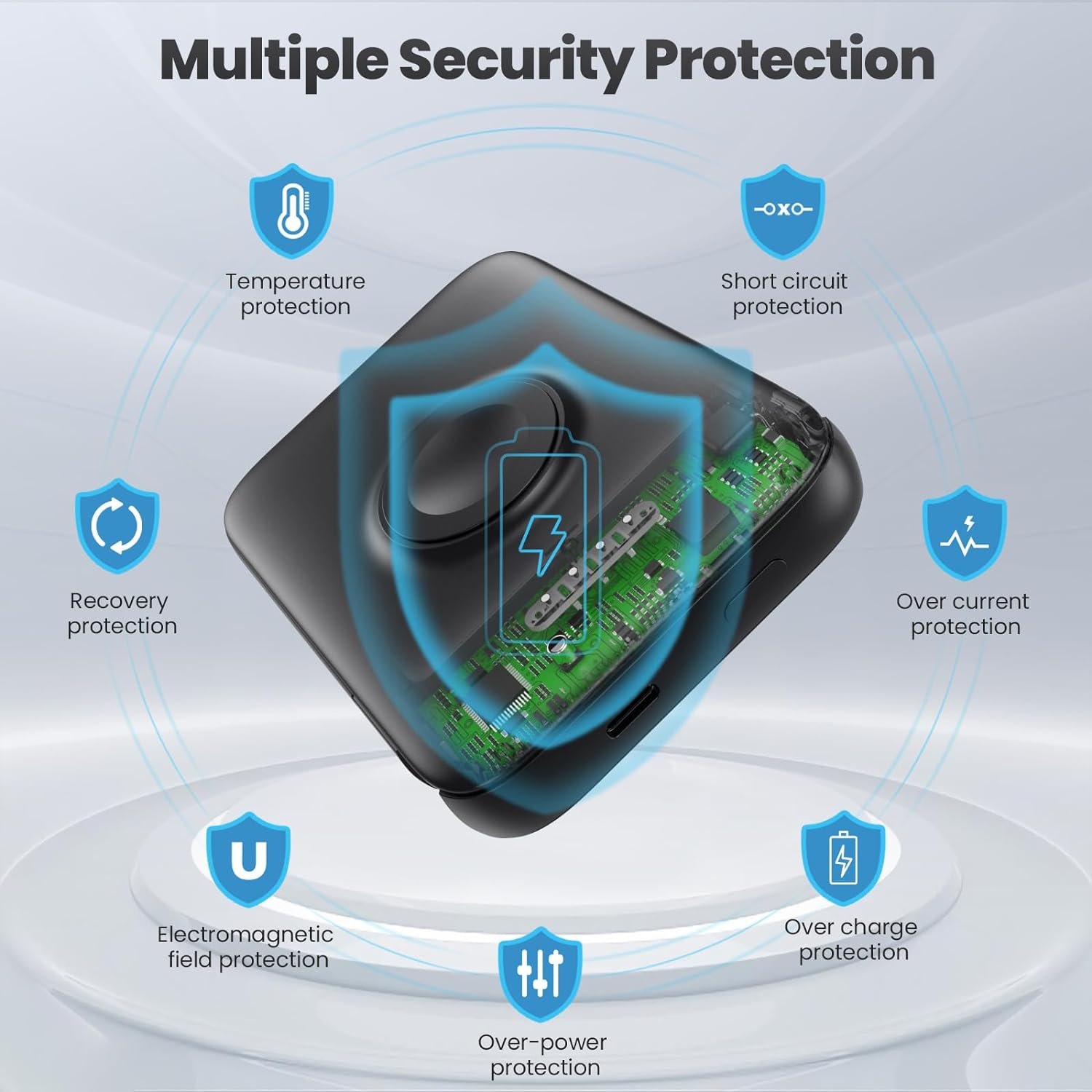 In order to prevent the continuous heating problem during the use of portable magnetic charger, our magnetic wireless power bank use the ice core cooling chip, better heat dissipation. Multiple over-current protection, over-power protection, over-voltage protection, over-temperature protection, short-circuit protection, input over-voltage protection, and over-discharge protection. Note:during the charging process, it is normal a little hot .