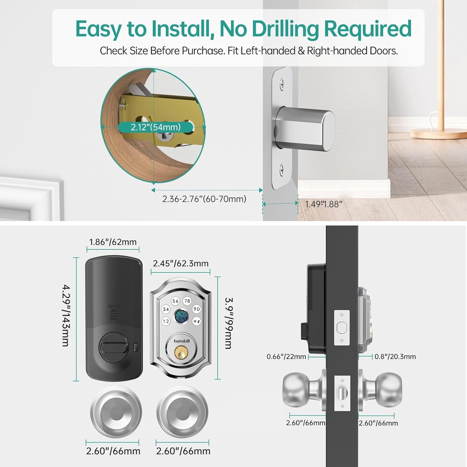 Easy Installation: The fingerprint door lock is easy to install in minutes with just a screwdriver, no drilling required and no need to hire a locksmith. Compatible with US standard left and right handed doors. The door thickness is from 1.49 inches to 1.88 inches and App is free to use forever.
