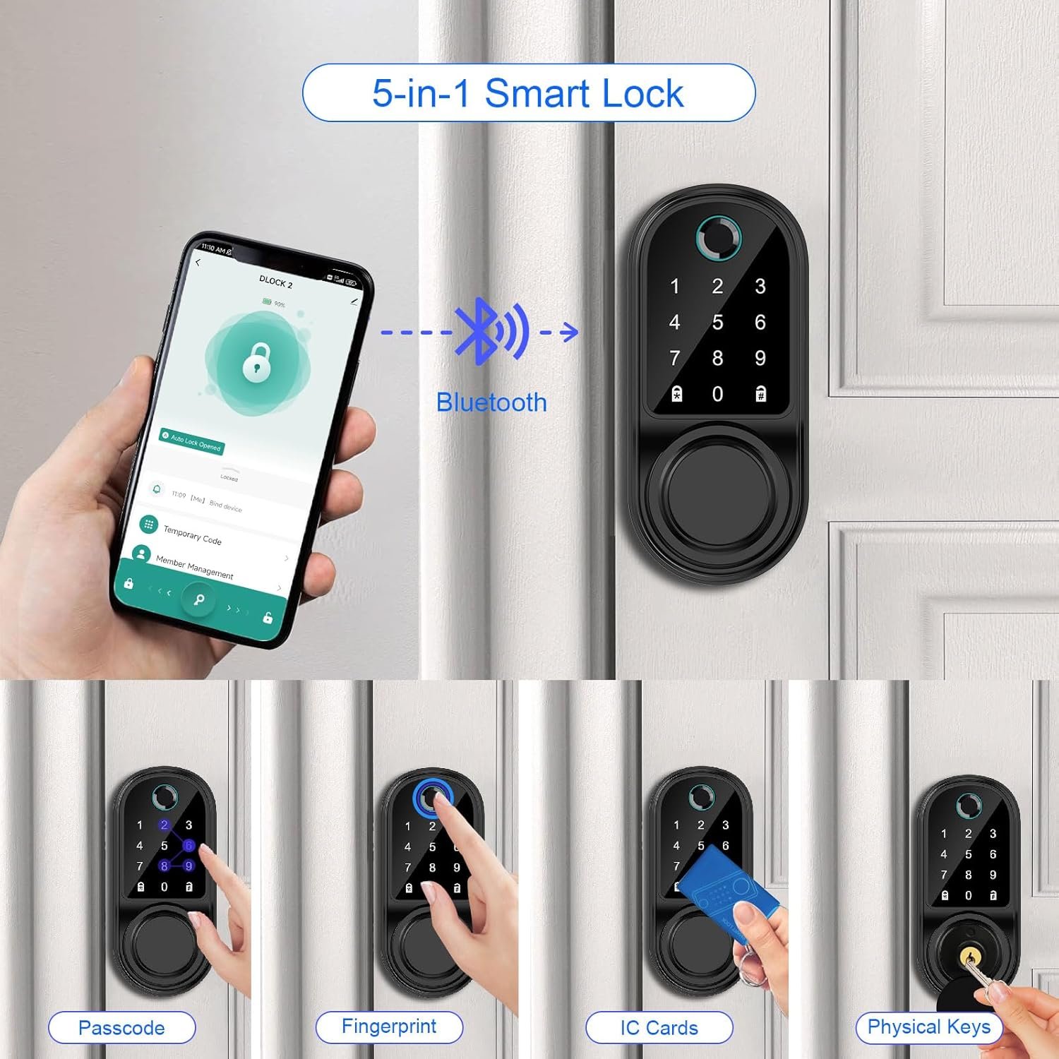 【5 Ways to Unlock】: 5 IN 1 smart lock: Fingerprint + Passcode + APP Control+ IC Cards (2 PCS) + Physical Keys (2 PCS). The door lock supports adding 100 fingerprints, 100 group passwords, and 100 pcs IC cards. Our keyless entry door lock brings tremendous convenience to every bedroom, apartment, hotel, and office.