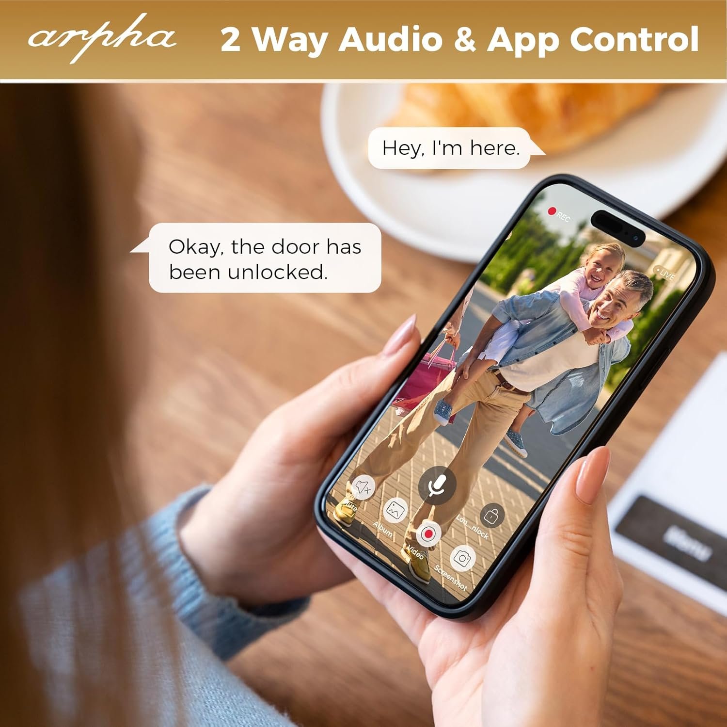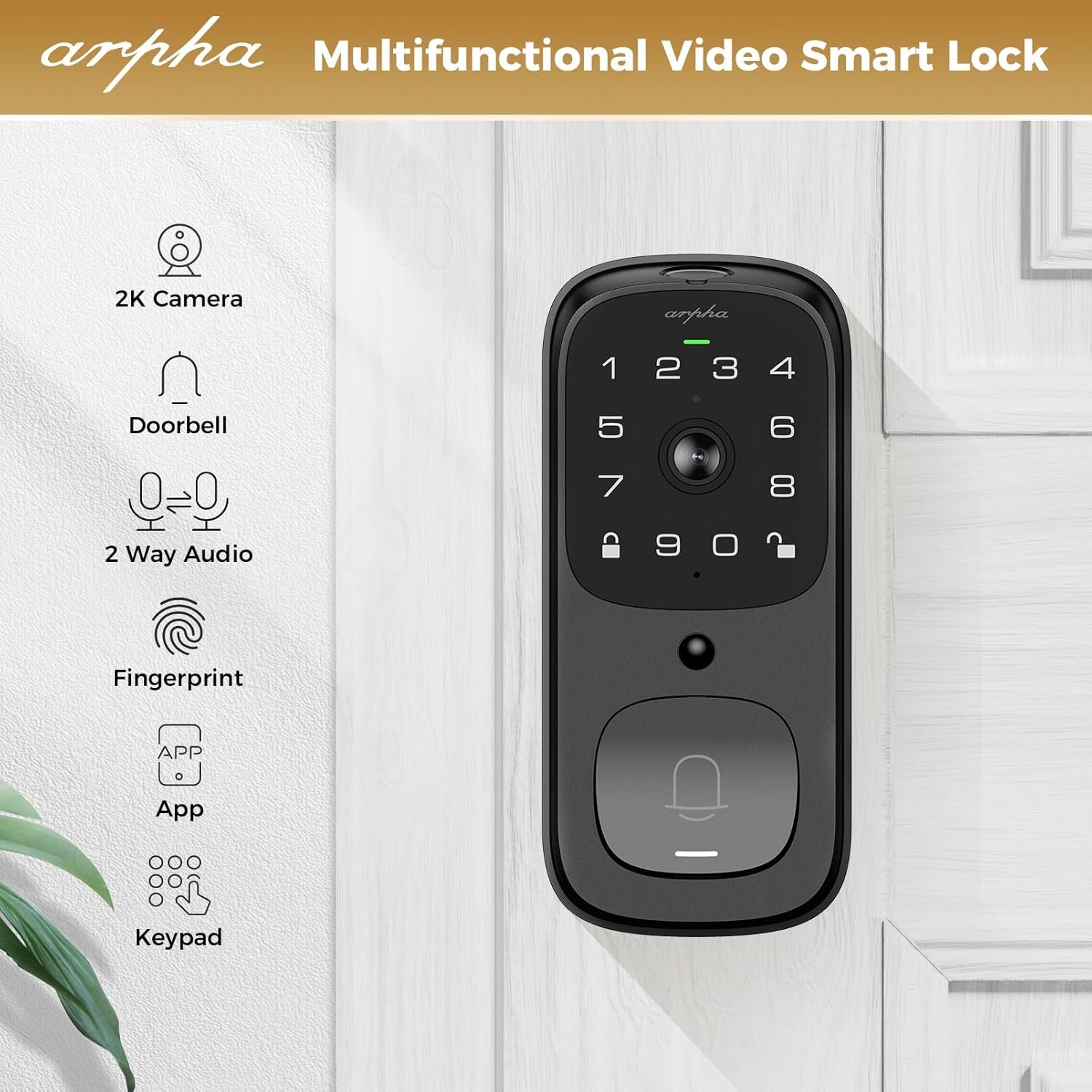 Smart Door Lock with Video Camera: Arpha AL501 video smart lock 2024 new model support WiFi door lock+2K HD camera+doorbell. Keyless entry door lock with camera supports 4:3 aspect ratio image. User could view front door package situation completly by ARPHA App.