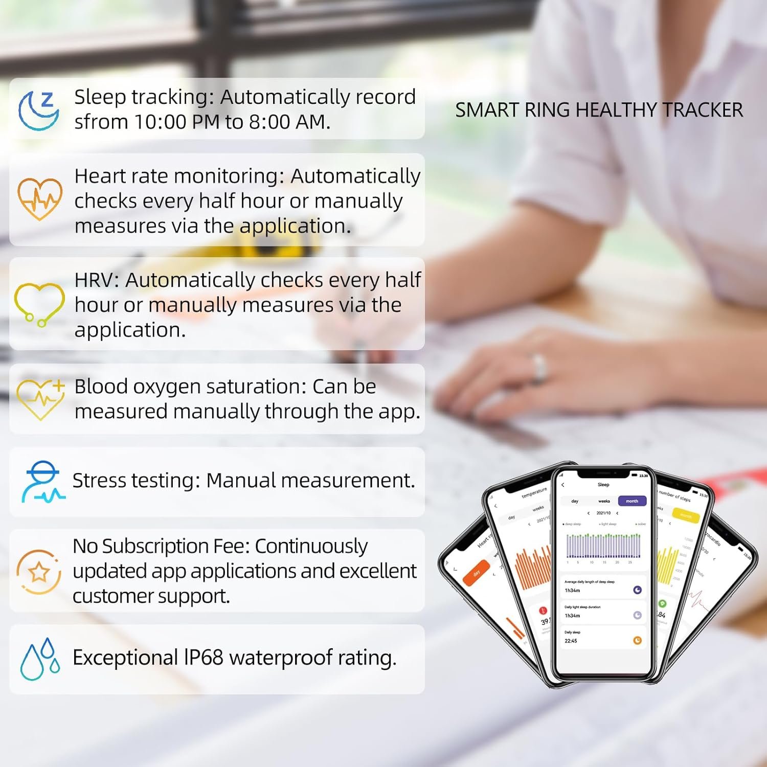 24/7 Heart Rate & Blood Pressure Monitoring:As a professional heart health consultant,the Smart Health Ring,equipped with a high-precision and high-performance heart rate sensor,accurately obtains data and monitors your heart activity 24/7.The Smart Ring Tracker intelligently analyzes the relationship between your activity and heart rate, while the app sends you reminders when your heart rate is too high