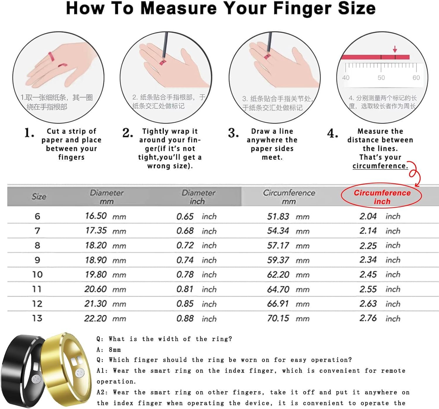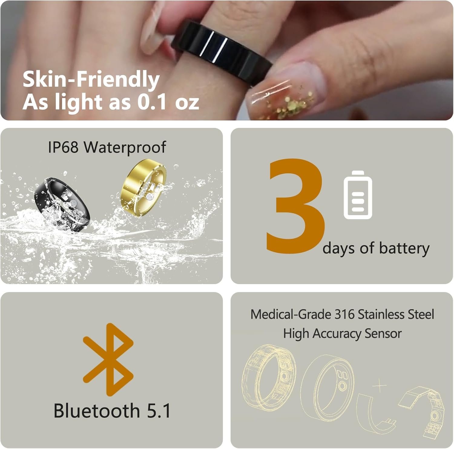 IP68 Waterproof Calorie Counter:Smart fitness ring is made of medical grade 316 stainless steel to provide maximum comfort,with ceramic surface and PVD vacuum coating process,ensuring superior workmanship and durability.Smart fitness ring tracker has an excellent IP68 waterproof rating,this ensures that you can wear it with confidence in the shower,while working out in the rain or even while swimming as it is waterproof up to 164 feet