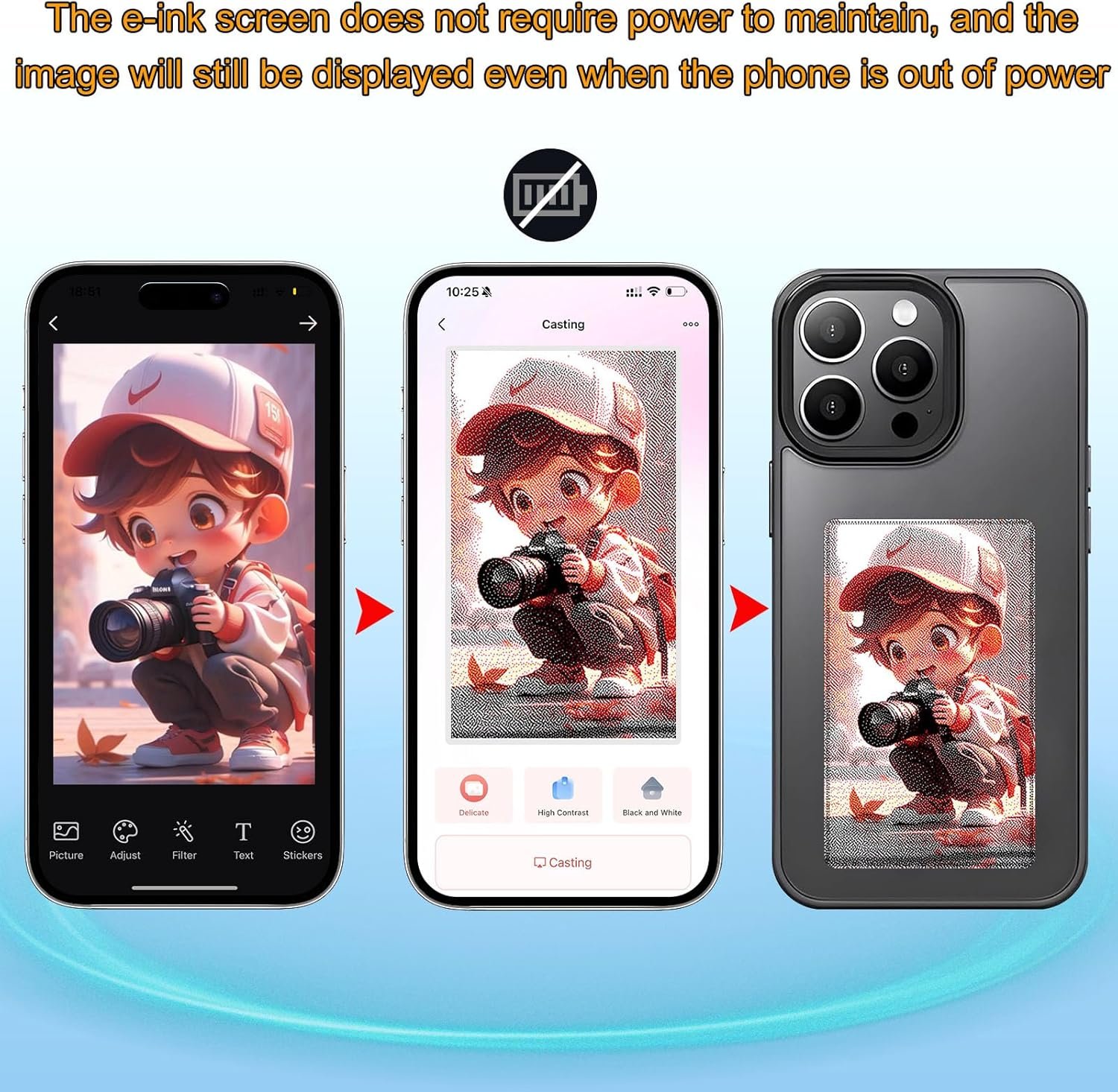 【NFC Intelligent Imaging】Utilizing NFC technology, the required display content can be easily transmitted to the ink screen of the phone case with low power consumption. Once displayed, even if the phone is turned off or the case is removed, the image will remain displayed for a long time.This feature ensures that images are maintained without consuming battery power.