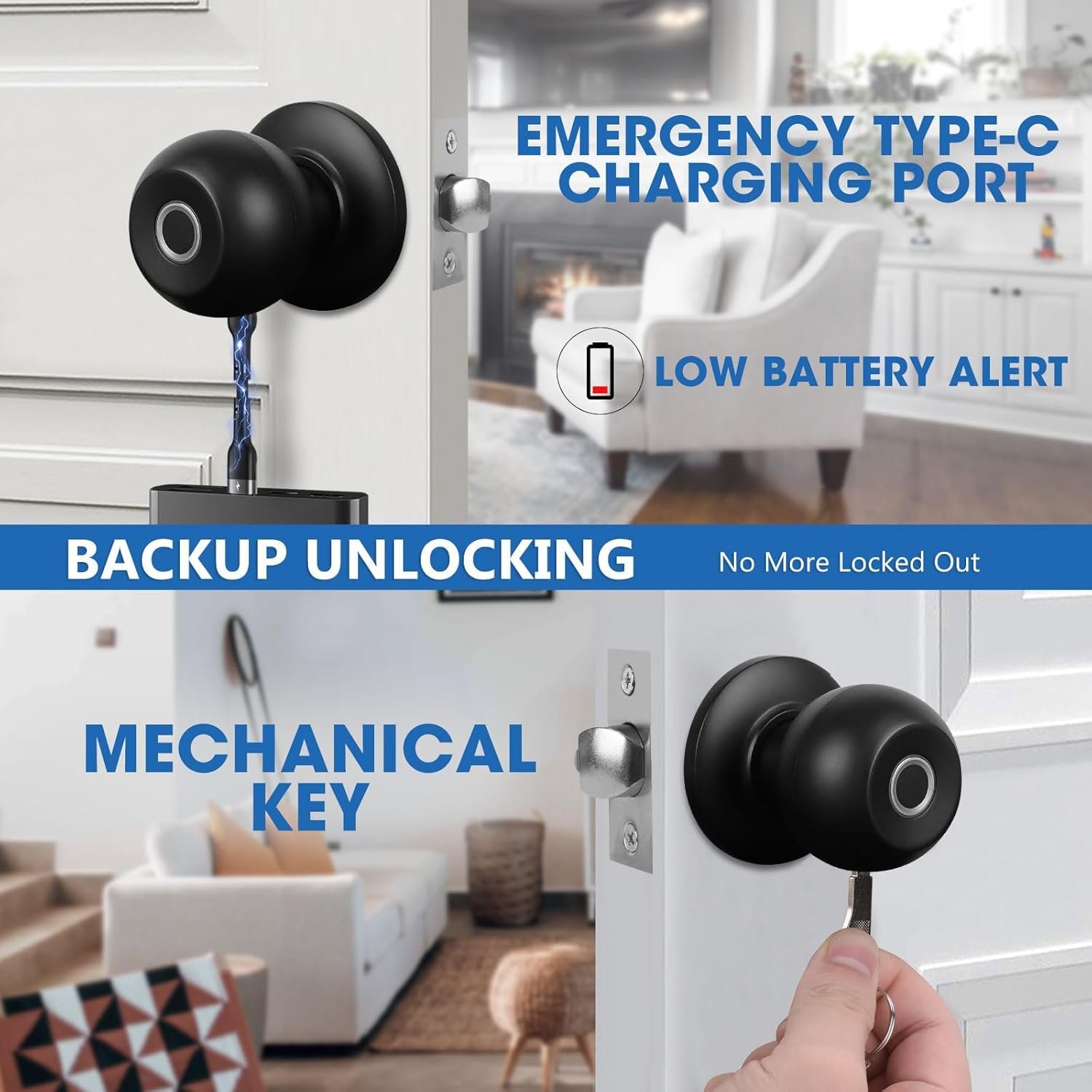3-in-1 Fingerprint Door Lock: Our advanced smart lock have 3 unlocking methods, including fingerprint identification, app control, and mechanical key, so you can choose the unlocking method according to your needs and preferences, and experience the unparalleled convenience and security of smart door knob