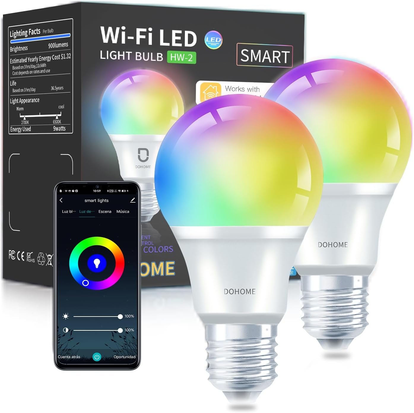 Smart Light Bulbs, Homekit Smart Bulb 9W 900LM Work with Alexa, Apple Home, Google Home 2.4GHz WiFi Bluetooth Light Bulb A19 E26 RGBWW Color Changing Dimmable LED Light Bulb 2Pack