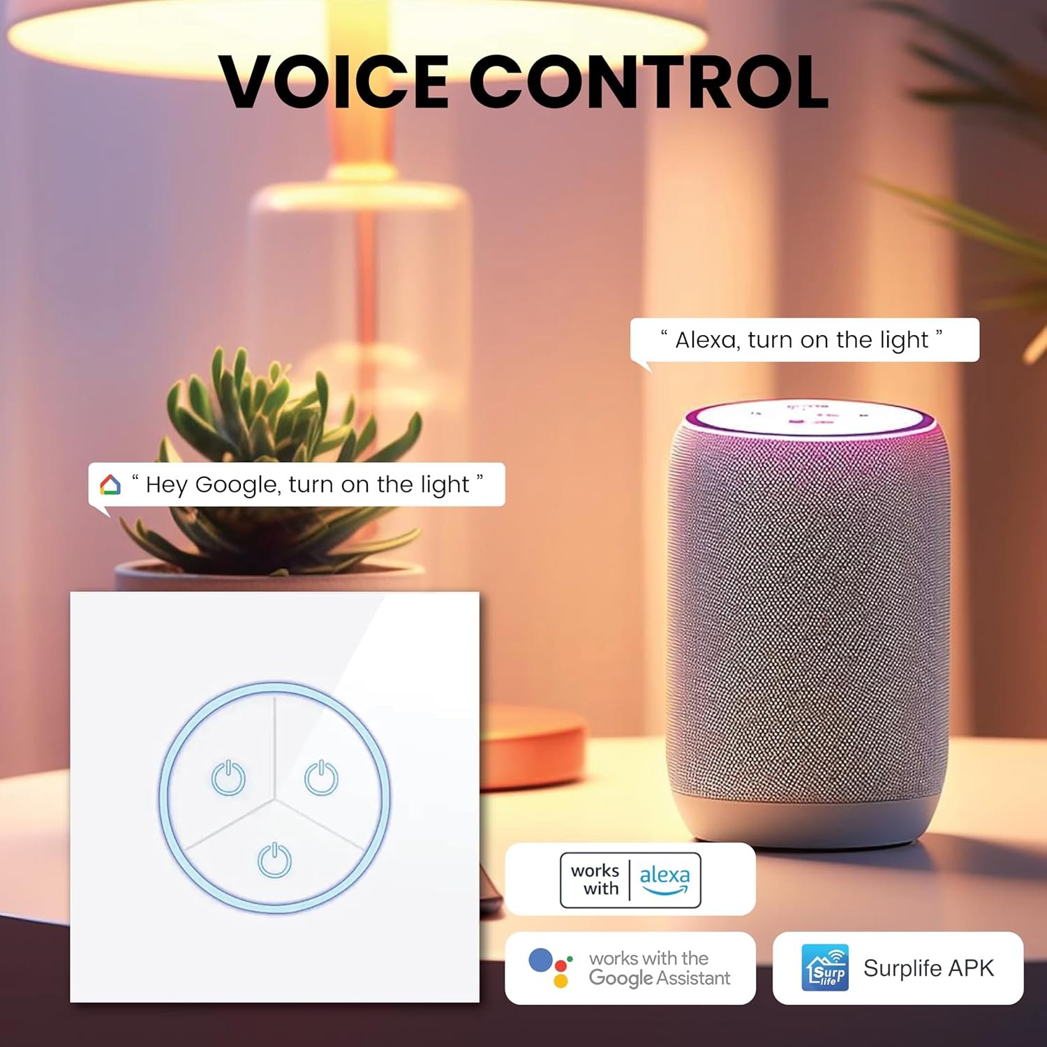 Automatic Voice control: Enjoy the hands-free convenience of controlling the lights in your home with your voice via Amazon Alexa or Google Assistant and can use Surplife App; perfect for times when your hands are full or entering a dark room.