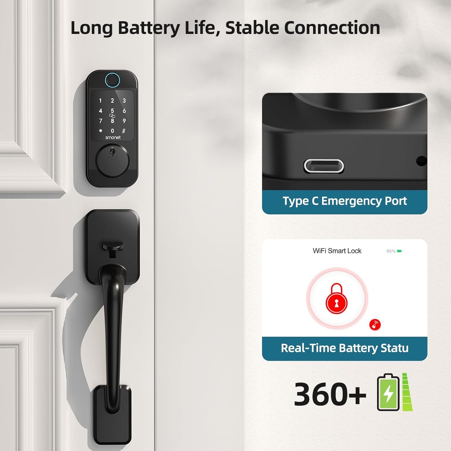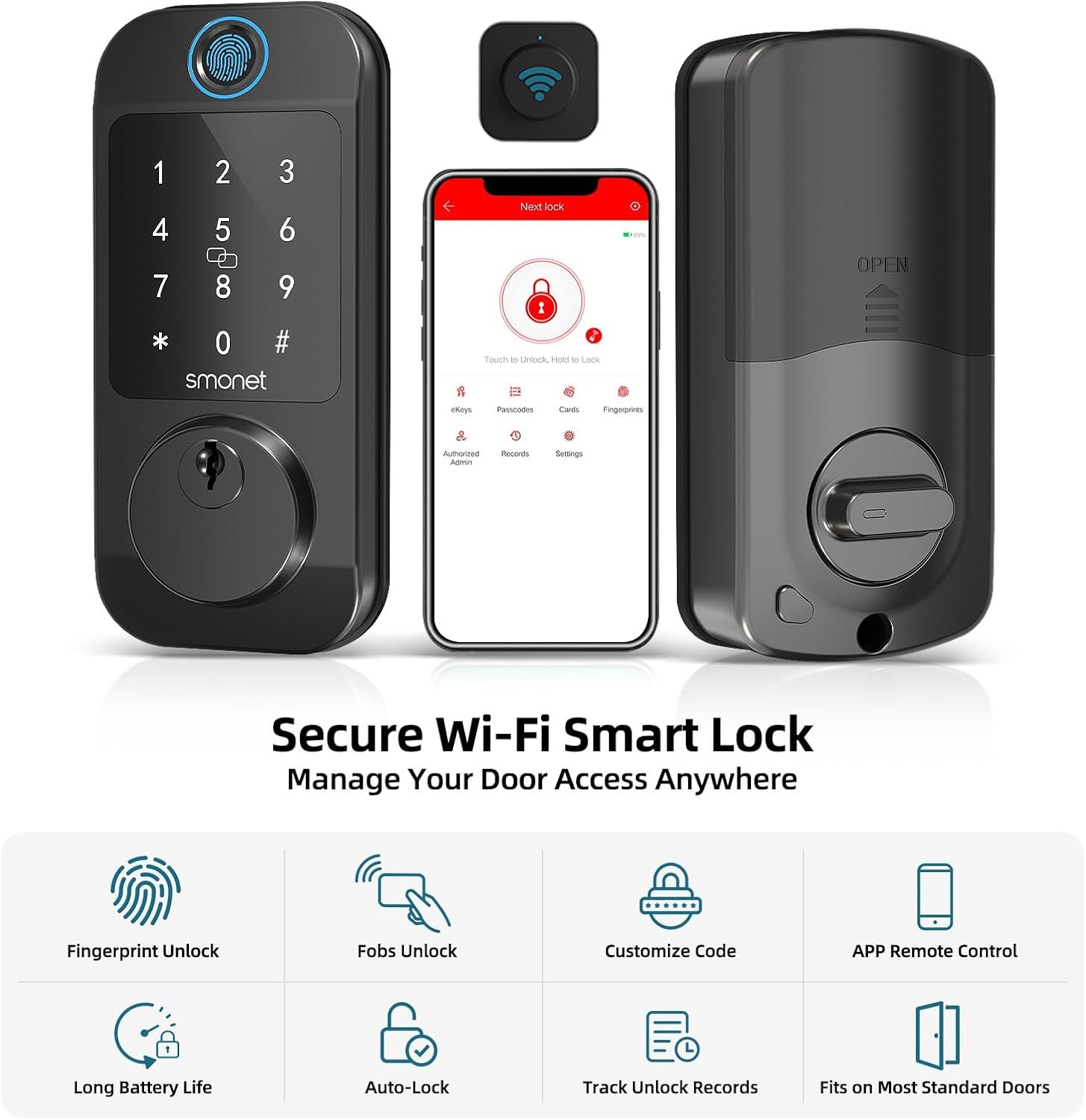 10 in 1 Secure Wifi Door Lock Deadbolt: SMONET wifi deadbolt provides Fingerprints/Smart App/Passcode/Key Fobs/Keys/Auto Lock/E-Key/Remote Control/ Alexa, Google Home Compatible/Real Time Record. With all these options, you never have to worry about losing your keys and being locked out. Simply choose the best unlocking method that suits your needs.